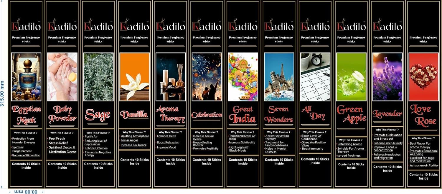 Experience the divine aroma of Kadilo Incense Sticks, handcrafted by underprivileged families in India. These hand-dipped incense sticks come in a pack of 72, with 12 sticks in each pack, totaling 864 incense sticks. Infused with natural essential oils, these incense sticks offer 12 unique fragrances that fill your space with long-lasting, mesmerizing scents. Enjoy a burn time of 55-60 minutes, ensuring a clean and even burn without any lingering bamboo odor. Kadilo Incense Sticks boast a 50-year legacy business in India, now serving customers in the USA. Their commitment to blending their own chemical and toxic-free essential oils ensures a pure and authentic experience based on Ancient Ayurveda. Ideal for use in churches, homes, or as an odour remover, these slow-burning incense sticks provide high customer satisfaction and a serene ambiance. Embrace the tradition and quality of Kadilo Incense Sticks for your spiritual,meditative practices, yoga, stress relief. Our special packaging mentions scent specific benefits as well.