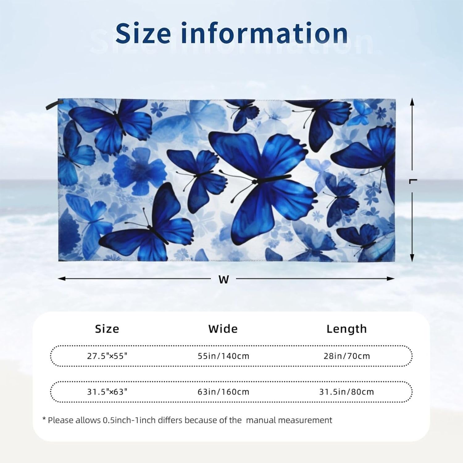 designBlue Butterflies compact towel for camping are designed with one-sided printing. The towels are equipped with special packaging bags and carabiners, which are convenient for packaging and hanging, and can be hung anywhere to dry quicklymaterialcompact towels for swimming is made of microfiber, which is more absorbent than standard towels, dries quickly, is lightweight, and small enough to easily fit the towel into a gym bag or backpackscene cotton towel for beach carabiner on the bag, can be attached or packed into your bag, the beach towel can also be used as a sports towel, travel towel, yoga towel or used as a beach, bathing, swimming pool, swimming, boating, sunbathing, mats for spa, sauna, water park, climbing, fitness, yoga, travel, camping, hiking, picnic, travel, outdoor and sports, etccomponentbeach blanket for swimming have buckle webbing, easy to hang and air dry, pvc packaging bag, equipped with a carabiner, easy to store and carrywashinglightweight towel for swimming machine washable, wash before first use, just hand wash or machine wash, air dry