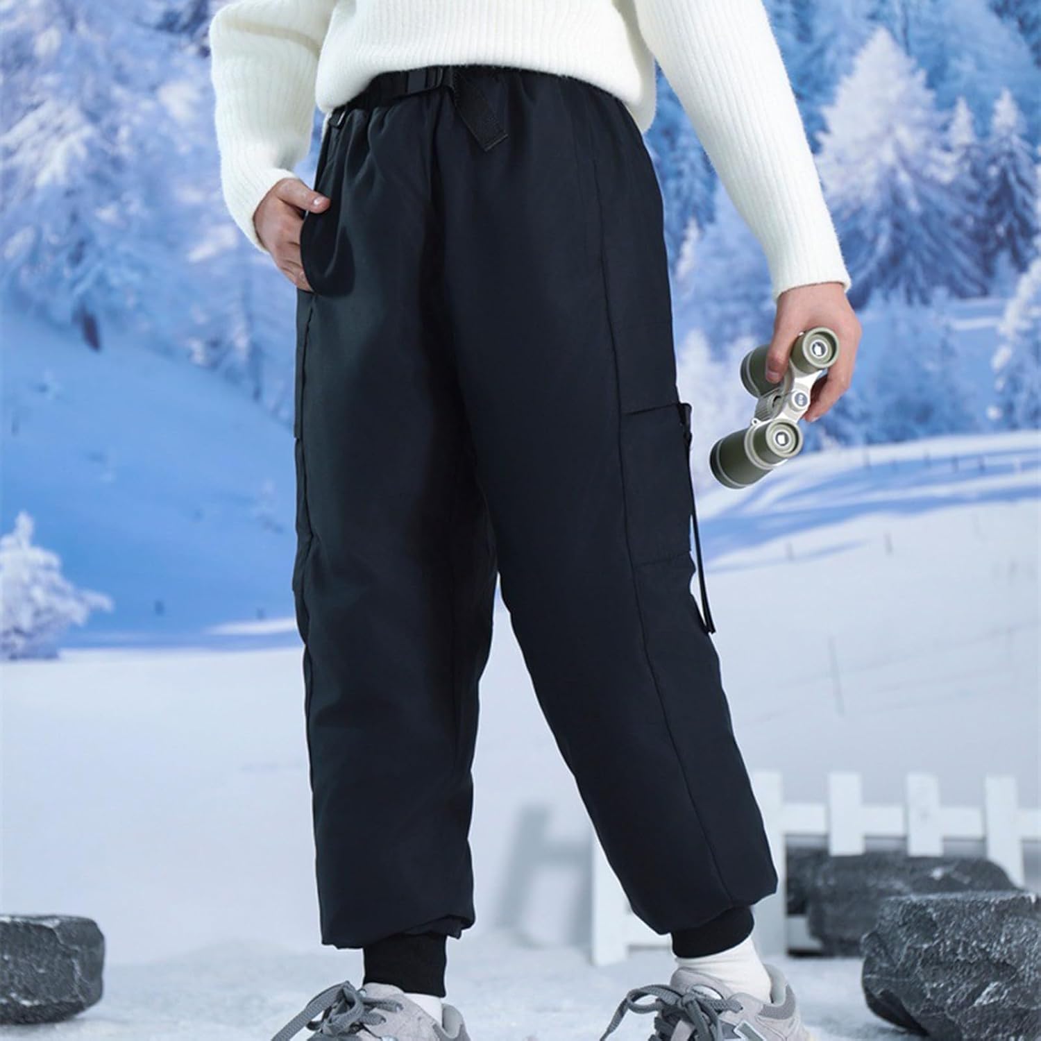 Waterproof and Windproof Outer Layer: Made of wear-resistant polyester fabric with a waterproof coating, it effectively repels rain, snow, blocks cold winds, and prevents water, keeping kids protected during outdoor regardless of the weather.Warm Lining: The inner layer is crafted from soft fleece with skin properties. It locks in warmth, keeps kids dry, and ensures breathability, providing lasting comfort even in cold conditions.Durable and Comfortable Design: Reinforced patchwork knees offer strong wear resistance, while softshell fabric balances durability and ease of movement, allowing kids to move without restriction.Practical Detail Features: Designed with an elastic waistband and belt loops, it includes 2 front secure zipper pockets for convenient storage of small items like keys and tissues, meeting outdoor storage needs.Versatile for Multiple Scenes: Combining waterproofing, warmth, and durability, these pants are suitable for winter activities such as skiing, hiking, and camping—ideal for both boys and girls. Choose the right fit using the size chart.