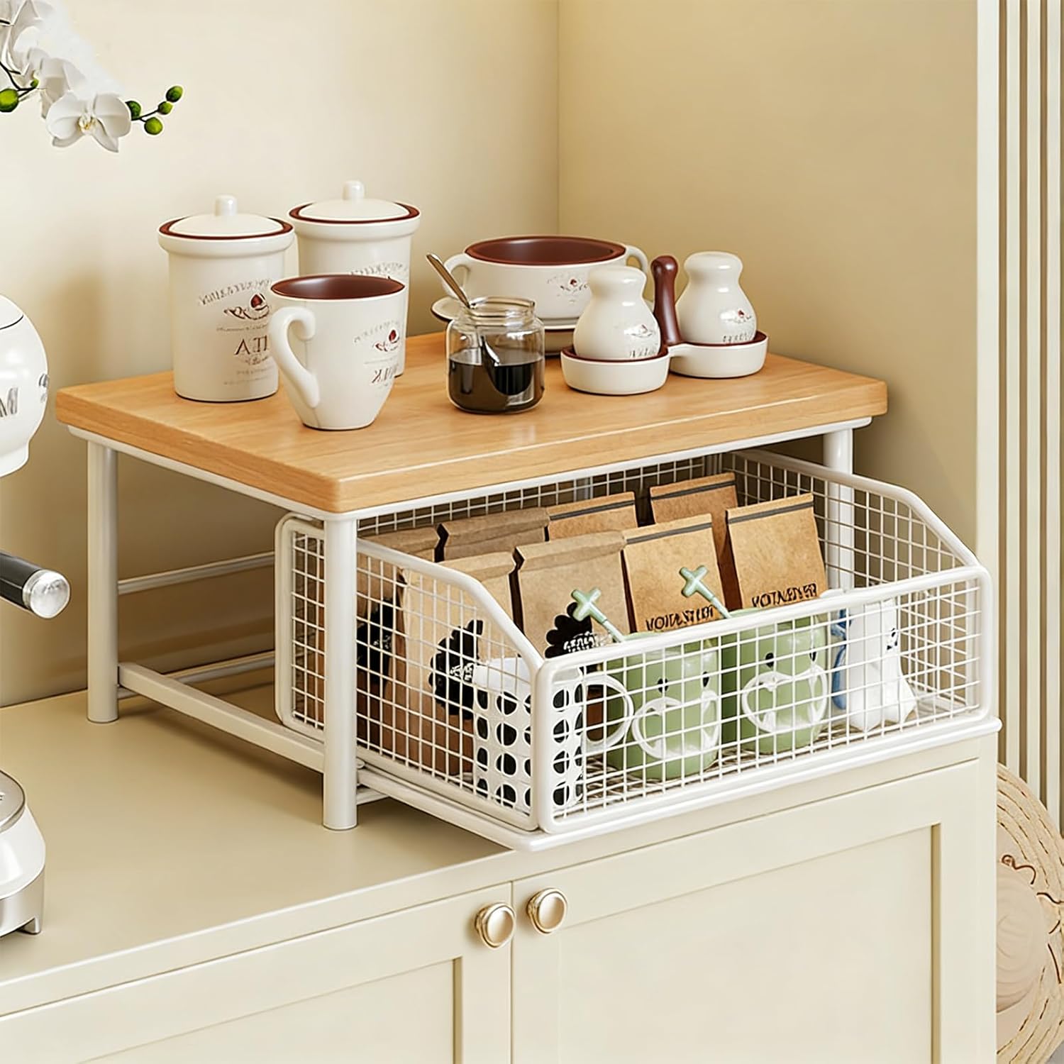 Tidy Up Your Kitchen With Our 2-Tier Countertop Organizer With Drawers! Maximize Vertical Space, Store Appliances, Fruits, Utensils And Snacks. Sturdy Wood, Smooth Sliding Drawers, Easy To Clean & Assemble—Ideal For Small Kitchens, Apartments And Dorms. Feature: 1. 2-tier vertical design to maximize vertical space and reduce clutter 2. Smooth-sliding drawer and wire basket for versatile storage Premium hardwood construction for durability and load-bearing capacity 4. Compact size, suitable for kitchens, bathrooms, offices and bedrooms 5. Eco-friendly, chemical-free material and easy to clean Specifications: Product Name: Kitchen Countertop Organizer with Drawers Product Dimension: 14.8*10.0*13.2in Product Weight: 1800g Color: Natural, Black, White, Brown Material: Hardwood + Metal Package Includes: 1Pc * Kitchen Countertop Organizer with Drawers 1Pc * Installation Accessories 1Pc * User Manual Notes: 1. Due to lighting and shooting angle, the actual color may differ slightly from the picture. Please refer to the actual product. 2. Manual measurement may have an error of 0.39-0.78in, please understand. After-sales Service: If you have any questions or problems during purchase or use, please contact us in time. We will solve your problems actively and ensure you have a pleasant shopping experience.