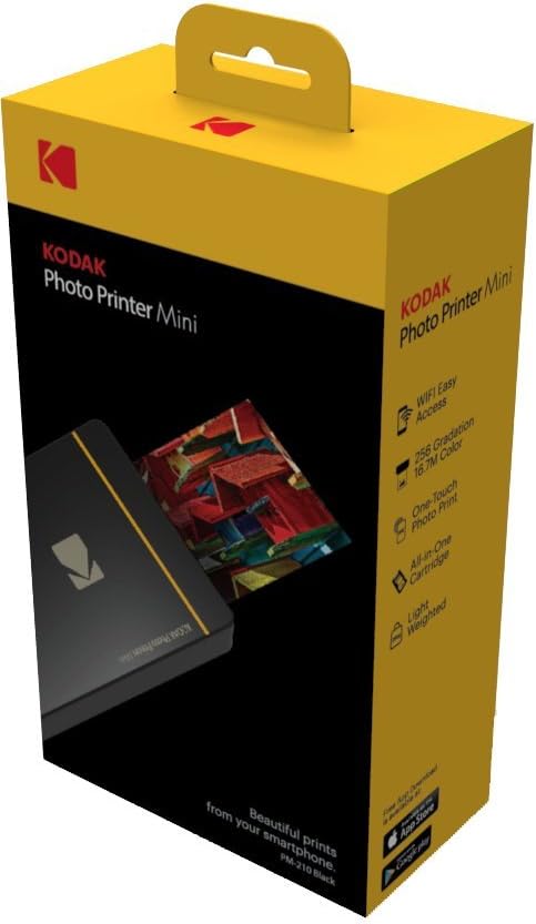 Wish you could print your phone’s camera roll with the touch of a button? With the Photo Printer Mini by Kodak, you hardly have to lift a finger. Just tap your Android device on the surface of the printer, and innovative NFC one touch has you editing and printing photos in an instant. This smart gadget is also fully compatible with iOS phones and tablets over Wi-Fi network. Watch as the all-in-one ink and paper cartridge produces stunningly detailed color prints in convenient 2.1 x 3.4” size. Fade-proof dye transfer technology ensures each photo will last for at least 10 years with its humidity- and fingerprint-resistant properties. Best of all, access tons of editing features via the free Kodak app, including cropping, collage, special ID print, and more. Ready to start printing your precious memories? Just tap to get started! 1 KODAK PM-210 Photo Printer Mini Built-in Wi-Fi Direct NFC & Wi-Fi technology 1 micro charger cable 1 8 Photo Cartridge Powerful printing that fits in your palm! Photo size: 54mm x 86mm (credit card size) Unit measures 76.1 x 152.8 x 24mm Weighs in at 238g Main connection: Wi-Fi Direct NFC & Wi-Fi Input: Micro 5-pin for charging Supporting file: JPEG Printing method: Dye sublimation thermal transfer Gradation: 256 Gradations/16.7 million colors App available via Google Play & App Store Compatible Ink Cartridges: PMC-20, PMC-30, PMC-50, PMS-20 Tap your Android phone, or connect iOS device over Wi-Fi Wait for the Kodak app to launch, then explore editing options Touch the easy command to print in a matter of seconds Watch your gorgeous color portraits come to life