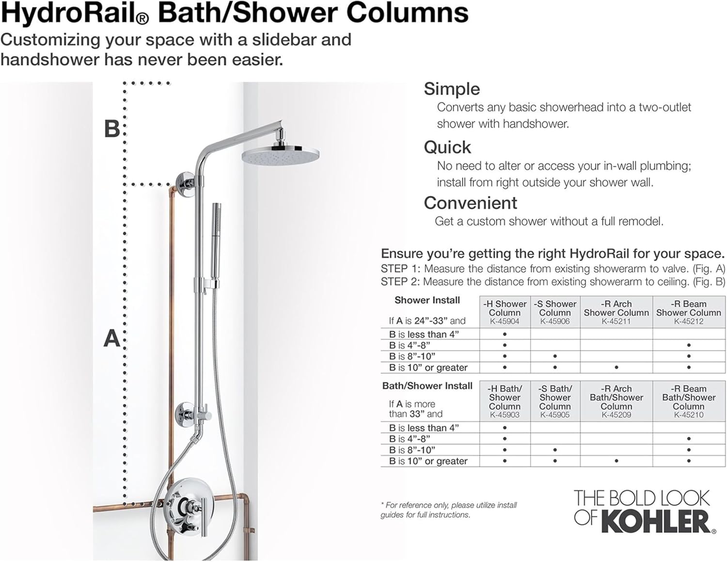 KOHLER HydroRail allows you to easily upgrade a standard fixed showerhead to a spa-like showering experience with luxurious showerhead and handshower functionality. It's designed to accommodate a wide array of shower configurations without altering in-wall plumbing, making it suitable for both remodels and new construction. This wall-mount shower column converts your single-outlet showerhead into a two-outlet custom showering experience, and has a slidebar bracket for easy height and angle adjustments to your handshower. For smooth toggling between handshower and showerhead functions, this column features a diverter conveniently located at the base of the column.