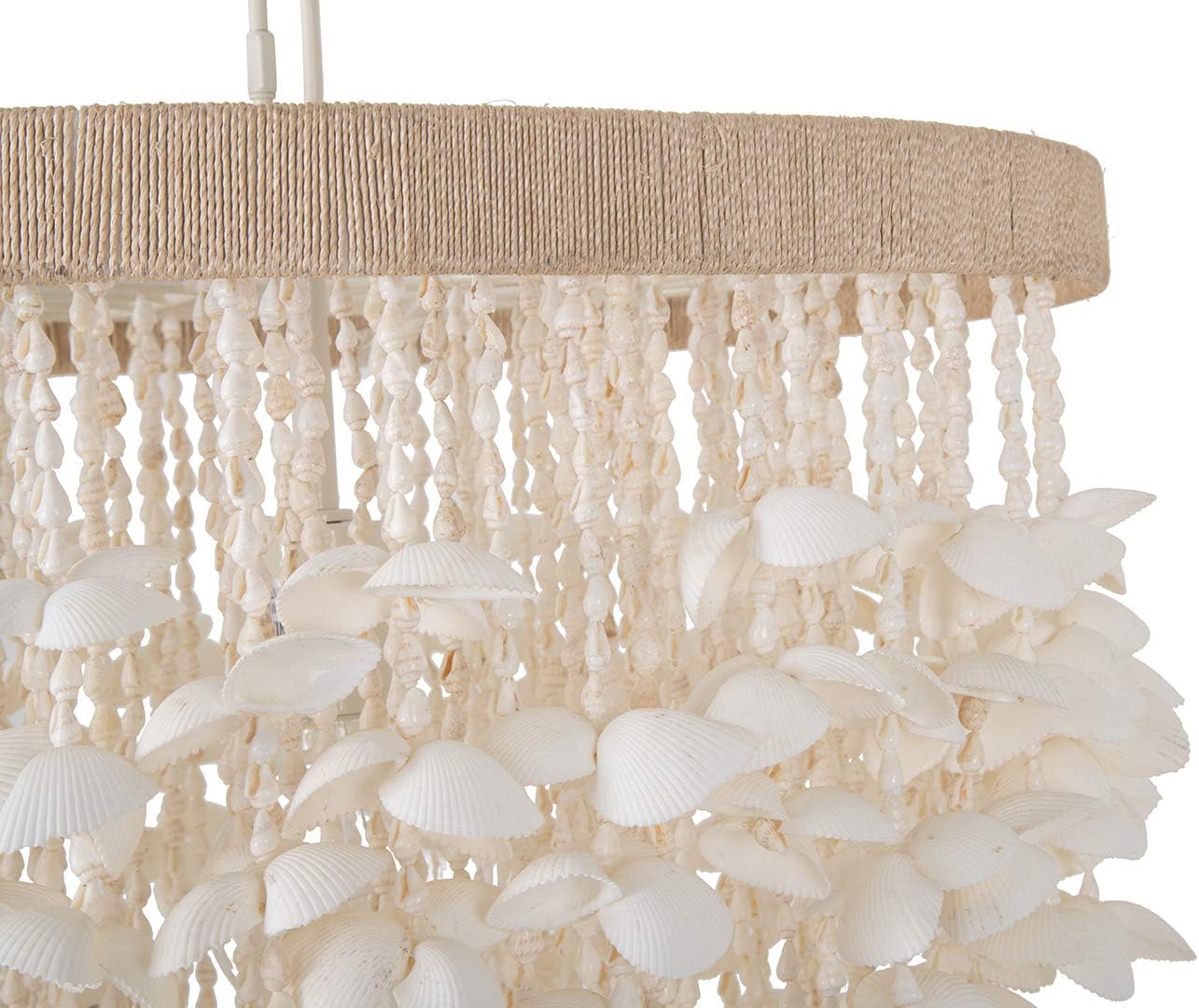 Invite a wee bit of the ocean into your home with this beautiful cone clamrose shell chandelier! The delicate white strands of seashells add texture, warmth and luminous rays of soft light in whatever room you grace these capiz lights in.