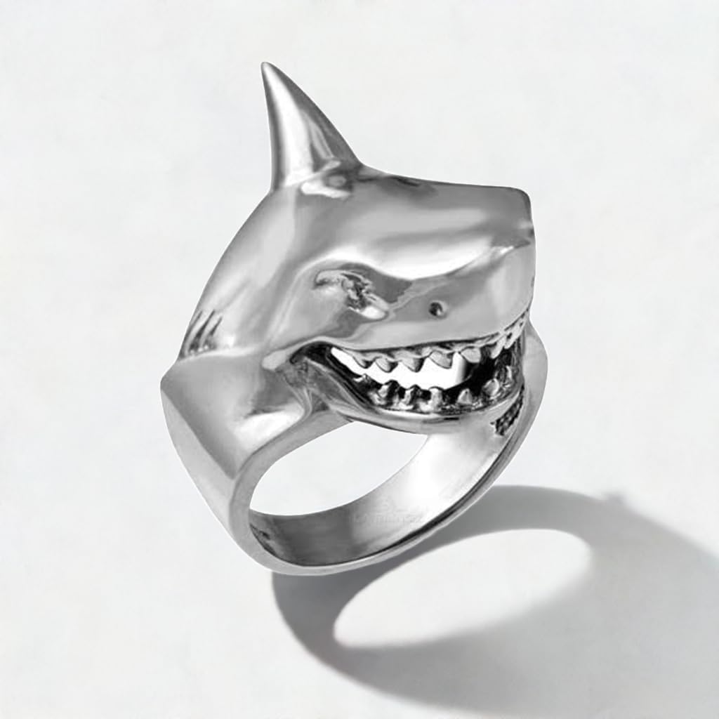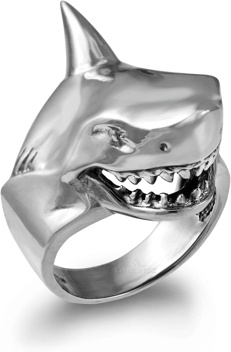 Unleash your daring side with our Sterling Silver 3D Shark Jaws Statement Ring - a bold and captivating piece for men. Crafted with precision, this polished ring showcases intricately designed shark jaws, making it a standout accessory. Dive into unique style and shop now!Dive into a world of adventurous style with our Sterling Silver 3D Shark Jaws Statement Ring. This mesmerizing piece is designed to capture the essence of the majestic sea predator - the shark. Crafted with meticulous attention to detail, this ring boasts a polished finish that adds a touch of sophistication to its bold appearance.As you slip this remarkable ring onto your finger, you'll feel a surge of confidence and power. The realistic and intricate detailing of the shark jaws creates a captivating focal point that will leave onlookers in awe. The lifelike design showcases the shark's teeth and jaw structure, making it a truly exceptional accessory for those who seek to make a statement with their sense of style.Our Shark Jaws Statement Ring is crafted to appeal to the daring and adventurous individuals who embrace their unique personality. Whether you're an ocean enthusiast, a thrill-seeker, or simply someone who appreciates extraordinary jewelry, this ring is bound to resonate with your inner explorer.This statement piece is crafted from high-quality .925 sterling silver, ensuring durability and lasting shine. The polished finish enhances its luxurious allure, making it a versatile and captivating addition to your everyday wear or special occasions.Material: Sterling Silver (925 silver).Top band width: 1.25" (31.5 mm).Bottom band width: 0.23 (6 mm).Ring weight: ≈16 g.Finish: high polish.Back: hollow.Gender: Men's.Made in the USA.
