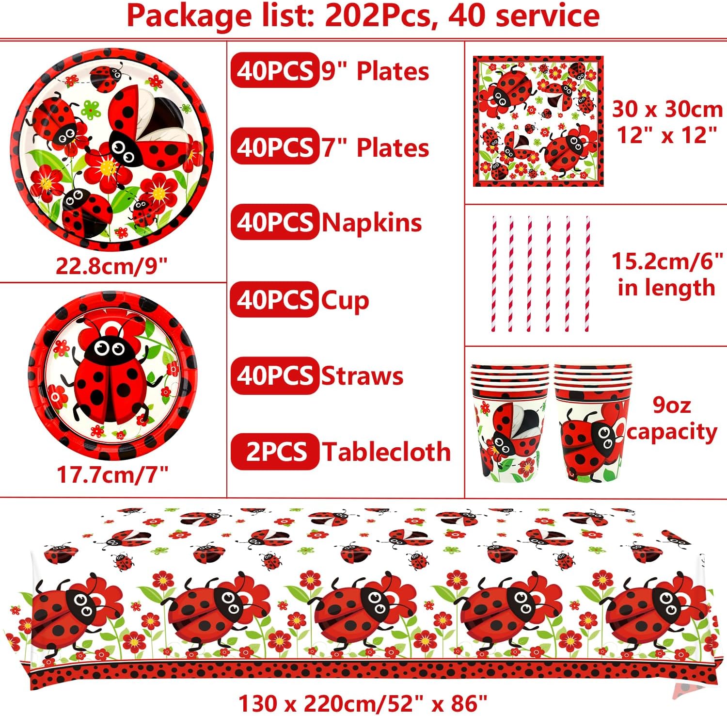 | Included Components | 1 ladybug Party Tablecloth, 20 7" dessert plates, 20 9"dinner plates, 20 9oz paper cups, 20 napkins |