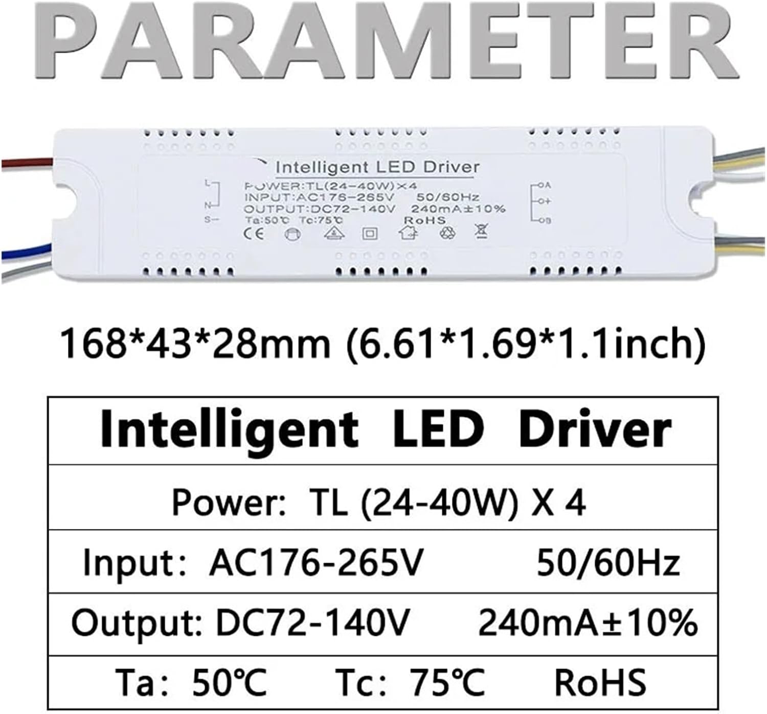Isolation TransformersProduct DetailsPower: TL (24-40W) X 4Input: AC176-265V 50/60HzOutput: DC72-140VCurrent: 240mA±10%Dimensions: 168*43*28 mm (6.61*1.69*1.1 in)Power: TL (40-60W) x 4Input: AC176-265V 50/60HzOutput: DC108-210VCurrent: 240mA±10%Dimensions: 168*43*28 mm (6.61*1.69*1.1 in)