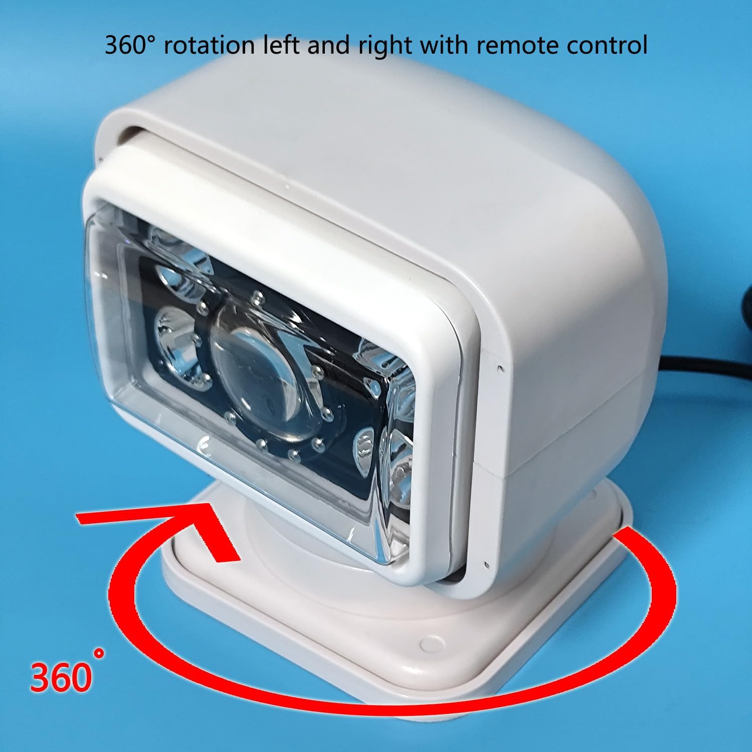 desc:search light with demote control, LED Power:70W,5600lm . Operating Voltage: 12/24 DC . Waterproof rate: IP 65 . 4pc*10W LED chips,1pc*30W Laser chip . Body Color: Black,White . Color Temperature: 6000K . Material:Diecast aluminum housing . Lens material:PC . Beam: 30 degee spot beam . 30000 hours above life time . Dimensions:7inch