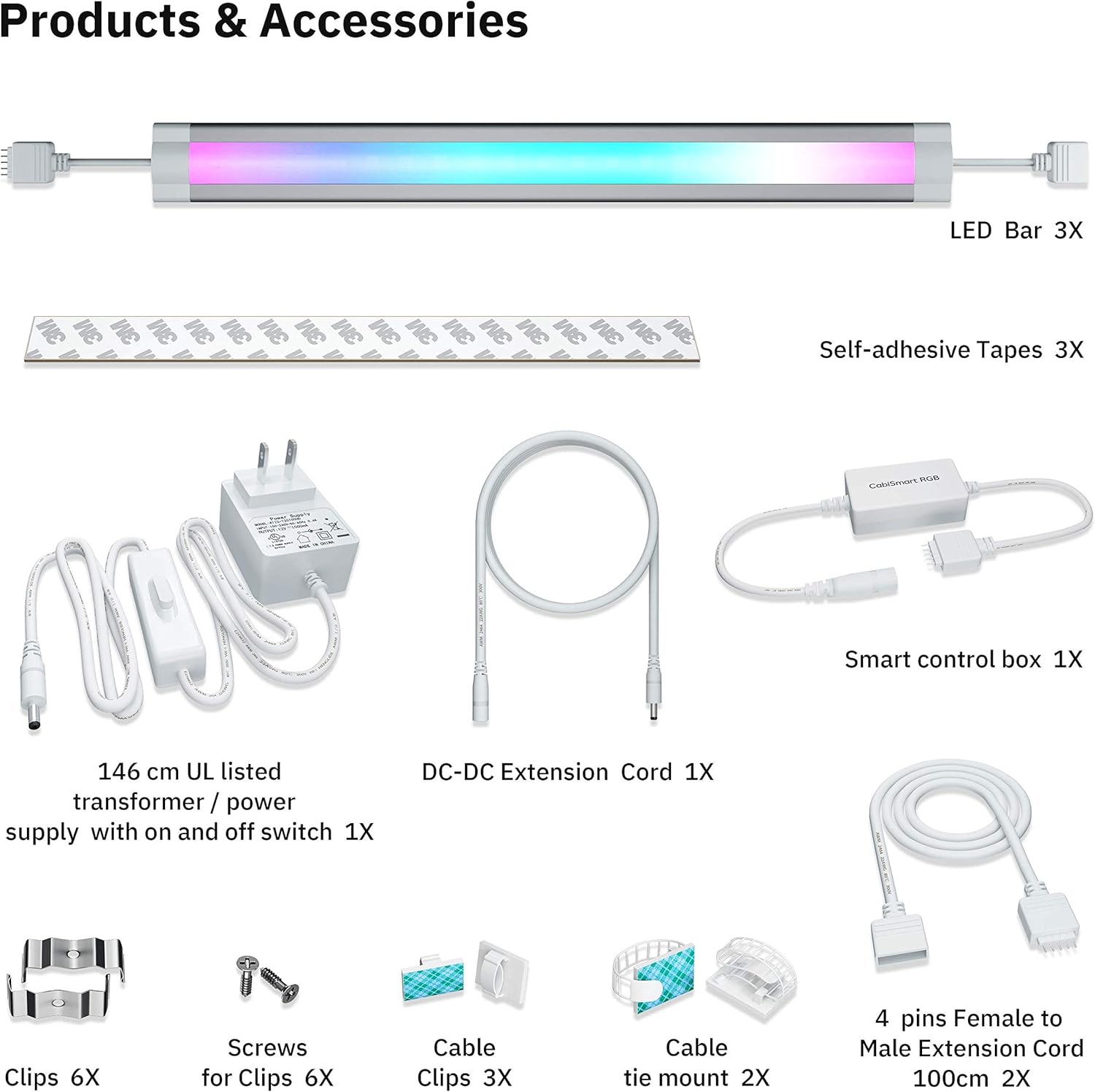 Smart Cabinet Light Color: RGB Multi Color Watttage: 12 Watt Dimension : L 12" W: 1.2" per Lights bar 3 Lights Voltage: 110VAC for transfomer and 12VDC for Lights bar Compatible devices: Google Assistant , Amazon Alexa, Smart Life App