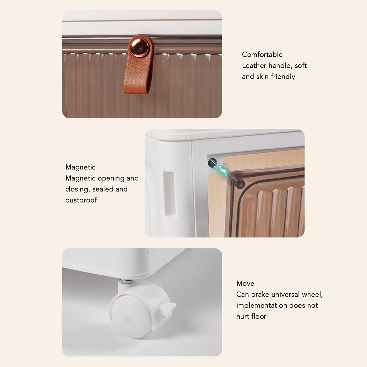 1. DOUBLE SIDED OPENING: The cabinet door magnet opens and closes, sealed and dust proof. Top large open cover, side magnetic opening and closing door, easy to take things2. EASY TO MOVE: Storage bins with brake universal pulley, the implementation has no damage to the floor, and sanitary dead corners at any time, save effort3. ROUNDED CORNERS: Plastic storage bins adopt rounded edges and corners design, farewell incisive edges and corners, knock is not easy to hurt, to the small members of the family4. STRONG LOAD BEARING: Stackable storage box is resistant to pressure and does not deform, thickened cabinet body, strong and does not shake, with good load bearing force, stable structure, and is not easy to deform5. EASY TO ACCESS: Stackable storage bins with semi transparent door panels, layered storage and handling, transparent and visible, avoid flipping cabinets6. STABLE STRUCTURE: The lidded storage bins are locked with layer upon layer buckle for stable superposition and superposition into cabinetsSpecification:Item Type: Storage BinsApplication: Shoes, CDs, stationery, bags, toys, sundry, books and magazines, change of clothes, othersApplicable Space: Study, kitchen, bedroom, bathroom, tea room, etc.Type: Folding cabinetInstallation Mode: Floor typeProduct Category: Storage cabinetMaterial: PPHow to Use:The cabinet should be opened and fixed in turn. After the wheels are installed at the bottom of the cabinet, the top cover can be covered.Package List:4 x Wheel1 x Storage Box1 x Lidor4 x Wheel2 x Storage Box1 x Lidor4 x Wheel3 x Storage Box1 x Lidor4 x Wheel4 x Storage Box1 x Lidor4 x Wheel5 x Storage Box1 x Lidor4 x Wheel6 x Storage Box1 x Lid