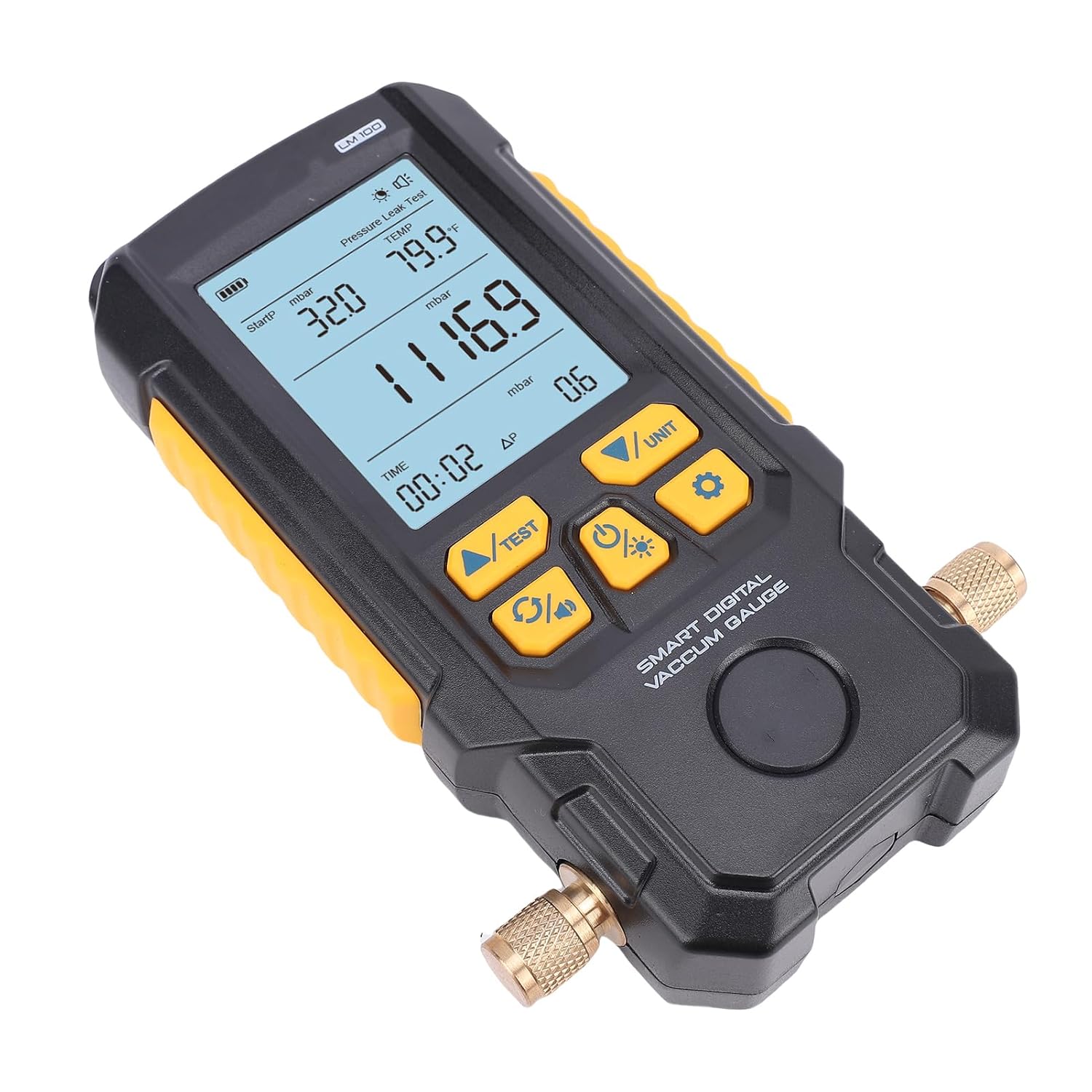 Measurement: Advanced sensor technology ensures 0.1mbar resolution and ±0.2% accuracy for reliable HVAC system diagnostics. Dual Operating Modes: Vacuum pumping mode tracks real-time pressure changes while holding test mode checks system integrity efficiently. High Visibility Display: 2.8" backlit LCD shows clear readings in any lighting with 0.5s response time for quick diagnostics. Portable & Energy Efficient: Foldable hook design with auto-shutdown (30min idle) runs on 4xAAA batteries for field use. Multi-Parameter Monitoring: Measures -67°F to 257°F temperature and 0-2000mbar vacuum with selectable units (hPa/mbar/Torr). Item Type: Refrigerant Vacuum Meter Product Material: ABS Temperature Unit: ℃, ℉, K Vacuum Unit: Hpa, mbar, Torr, inHg Temperature Range: -55-125℃, -67-257℉, 218-398K Vacuum Range (rel): 0-2000mbar, 0-1500Torr Absolute Pressure: 0-2000mbar Temperature Resolution: 0.1℃, 0.1℉, 1K Vacuum Resolution: 0.1Hpa, 0.1mbar, 0.01Torr, 0.01inHg Temperature Accuracy: +0.5℃ (±1 digit), ±0.9℉ (±1 digit), ±0.5K (±1 digit) Vacuum Accuracy: +0.2% of full scale Operating Temperature: -10-60℃ Battery: 4 x AAA Dry Battery (not included) Product Size: Approx. 118 x 42 x 168mm / 4.6 x 1.7 x 6.6in 1 x Vacuum Meter 1 x Connection Cable 1 x Connecting Tube 1 x Connector 1 x User Manual