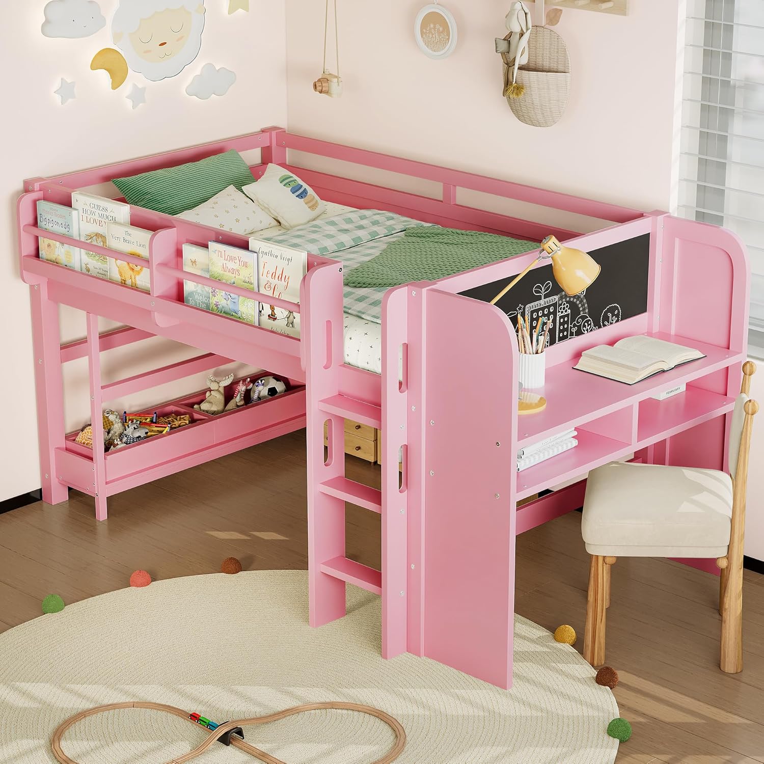 This kids’ loft bed is designed to maximize space while keeping toys and daily essentials neatly organized. The top bunk features 11.8-inch full-length safety rails and a three-step ladder for secure access, with solid wood slat support—no box spring needed. Along the side of the bed, a built-in bookshelf keeps bedtime stories within easy reach. Below, the spacious under-bed area includes a built-in desk with an attached blackboard—perfect for homework, drawing, or creative play. Side storage shelves and removable bins offer flexible, clutter-free organization; bins can stay neatly on the shelf or be moved anywhere. Built from high-quality pine wood, plywood, and MDF, this bed combines safety, sturdiness, and fun—ideal for any child’s bedroom. Weight & Dimensions: Product Type :Wood Low Loft Bed Color: White/Pink/Natural Size:Full Material: Pine Wood+Plywood+MDF Overall Product Dimension: 95.20”L*59.7’’W*43.70”H Overall Product Weight: 171.96 LBS Recommend Mattress Thickness of Bed(Upper/Down) :6’’ Weight Capacity: 550LBS for for Bed, 15LBS for shelves, 66LBS for table, 33LBS for storage box Number of Package: 2 Package Dimension & Weight: Please refer to the Specification Level of Assembly: Full Assembly Needed Eligible for Hardware Packs: Yes Country of Origin: Vietnam Note: All the pictures are taken by actual samples, slight chromatic aberration may occur due to lighting or display.