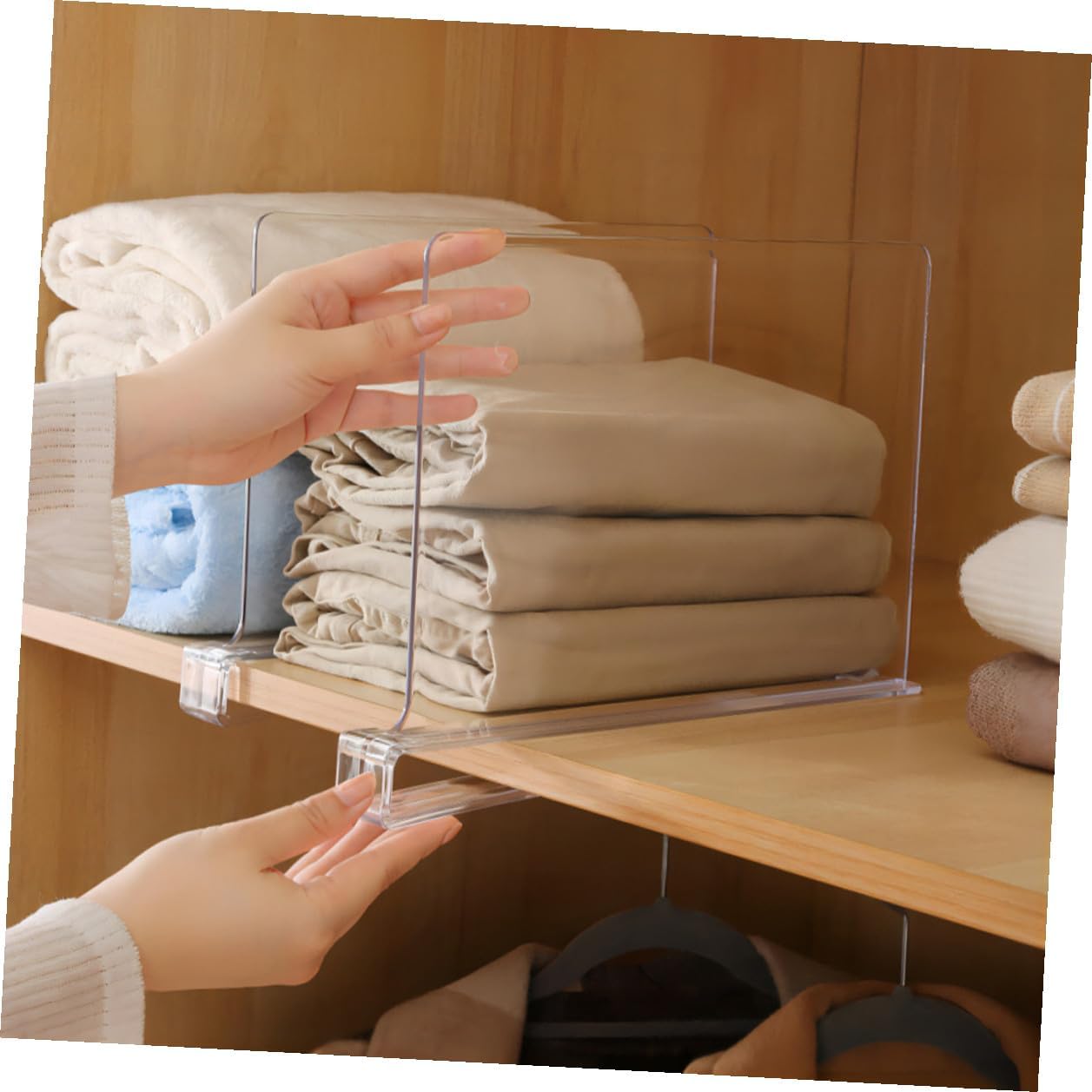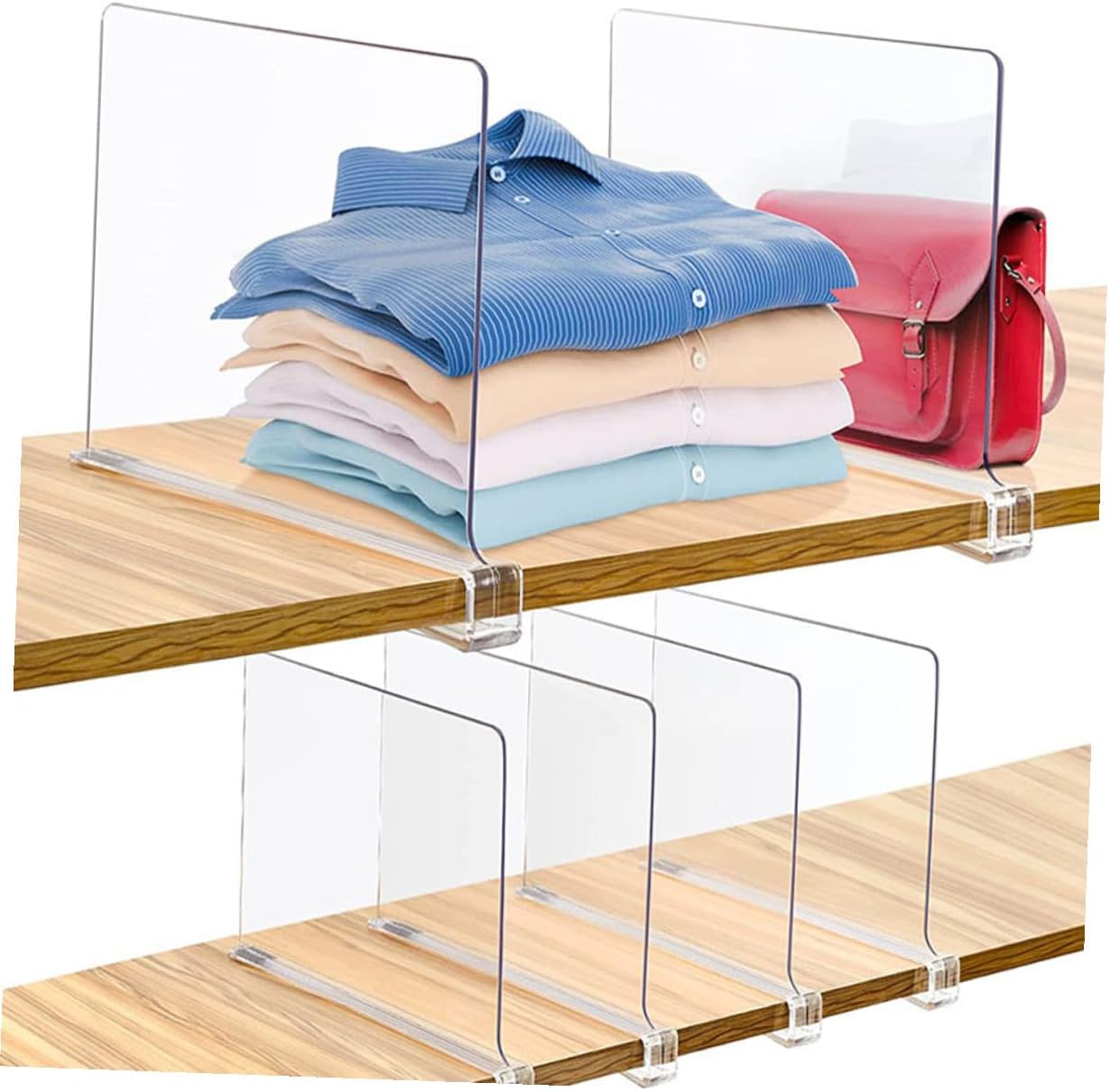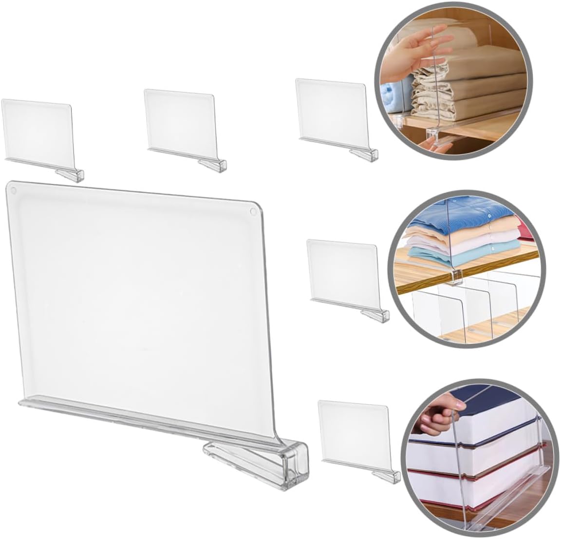 Package List 6 x Shelf Dividers Features -Product Info:Storage board -Size:30.50X20.50X3.00cm/11.99X8.06X1.18in -Material: -Color:Transparent -This clear divider allows you to classify your closet, to make full use of the storing space transparent wardrobe divider. -Made of reliable and strong material, very , practical and simple for long-term use. -Create compartments in the drawers to keep everything in order, convenient to use for your home Closet Divider. -Suitable for wardrobe, kitchen, office storage to maximize closet storage space Clothes Organizing Shelf Dividers. -Adoption the unique design, they will not destroy the interior decor, make your closet neat and tidy closet separators for clothes.Goods DescriptionWardrobe Dividers Not just for your closet, shelf dividers are also perfect for your kitchen cupboards or pantries to keep goods separated and organized.Shelving Clothes Divider And more besides, you can also use it in the office to tidy up notebooks, binders or books.Closet Shelf Divider Use craft rooms to keep supplies in their place