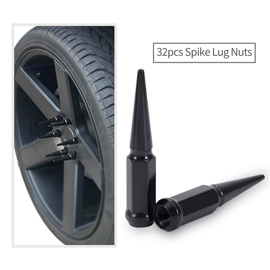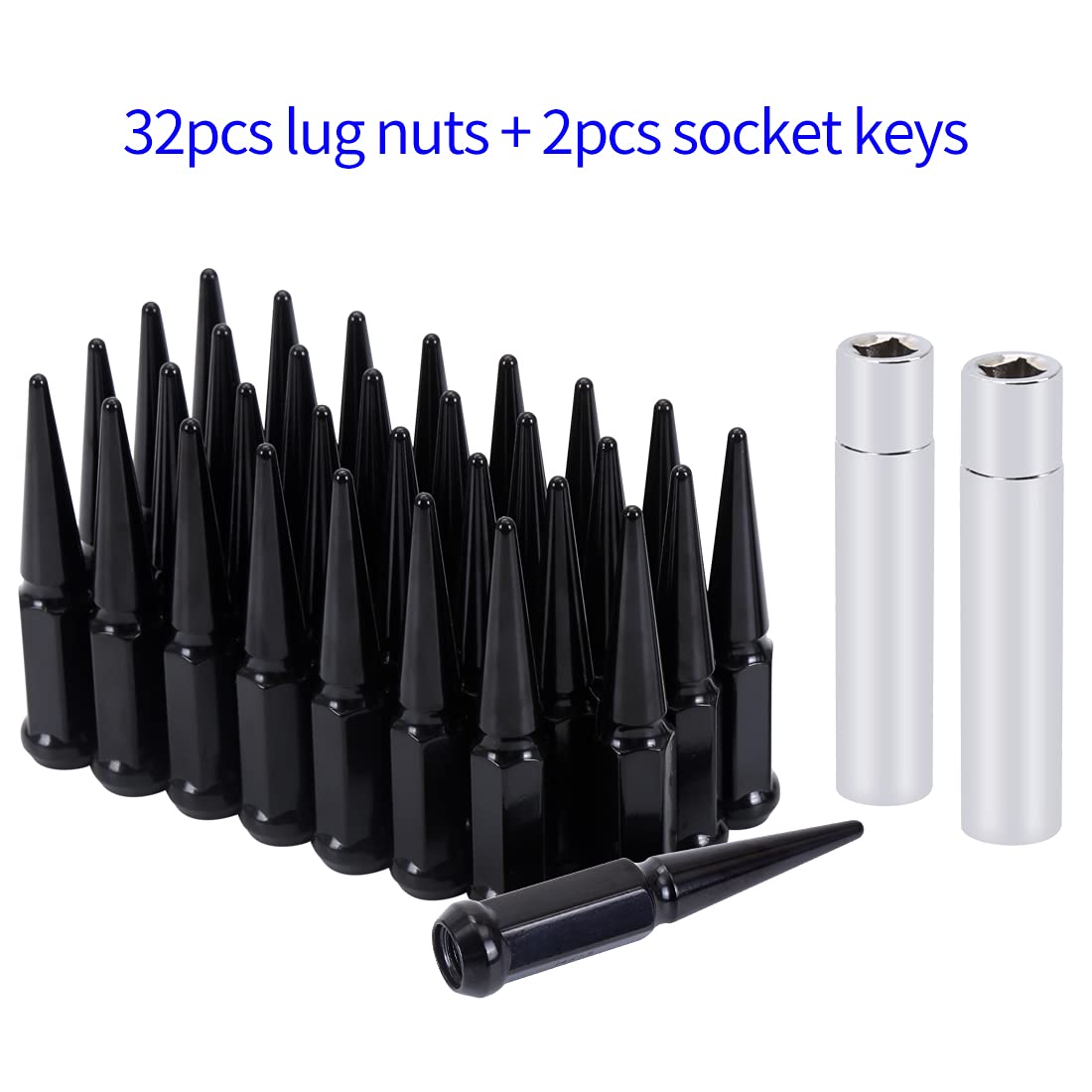 Product included: 32 pcs black spike lug nuts and two socket keys.