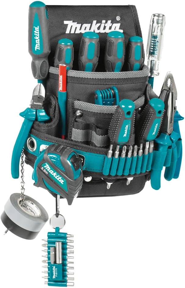 Makita is the leading manufacturer of professional power tools on the market. Introduction to Makita 3 Layers “3L Technology”; 3L Technology is a unique triple layer combination of polyester and foam to help provide additional cushioning, designed to be tough and weatherproof, these light polypropylene panels can be secured in any desired configuration. The panels can be formed into any shape required. The E-15241 Ultimate Electricians Pouch is equipped with 2 main deep pockets, ideal for storing electricians’ tools, 12 elastic loops at the front for easy access, 3 elastic loops on the sides, a Real Leather wide knife slot holder and 2 polyester holders on the sides. E-15241 has a metal D-Ring to hang items with a carabiner, T-shaped chain hook to access tapes and tool slots made from strong rubberised polyester. The E-15241 can be worn on any Makita tool belt or normal clothing belt. Length 250mm, height 310mm, width 125mm, capacity 1.7 litres.