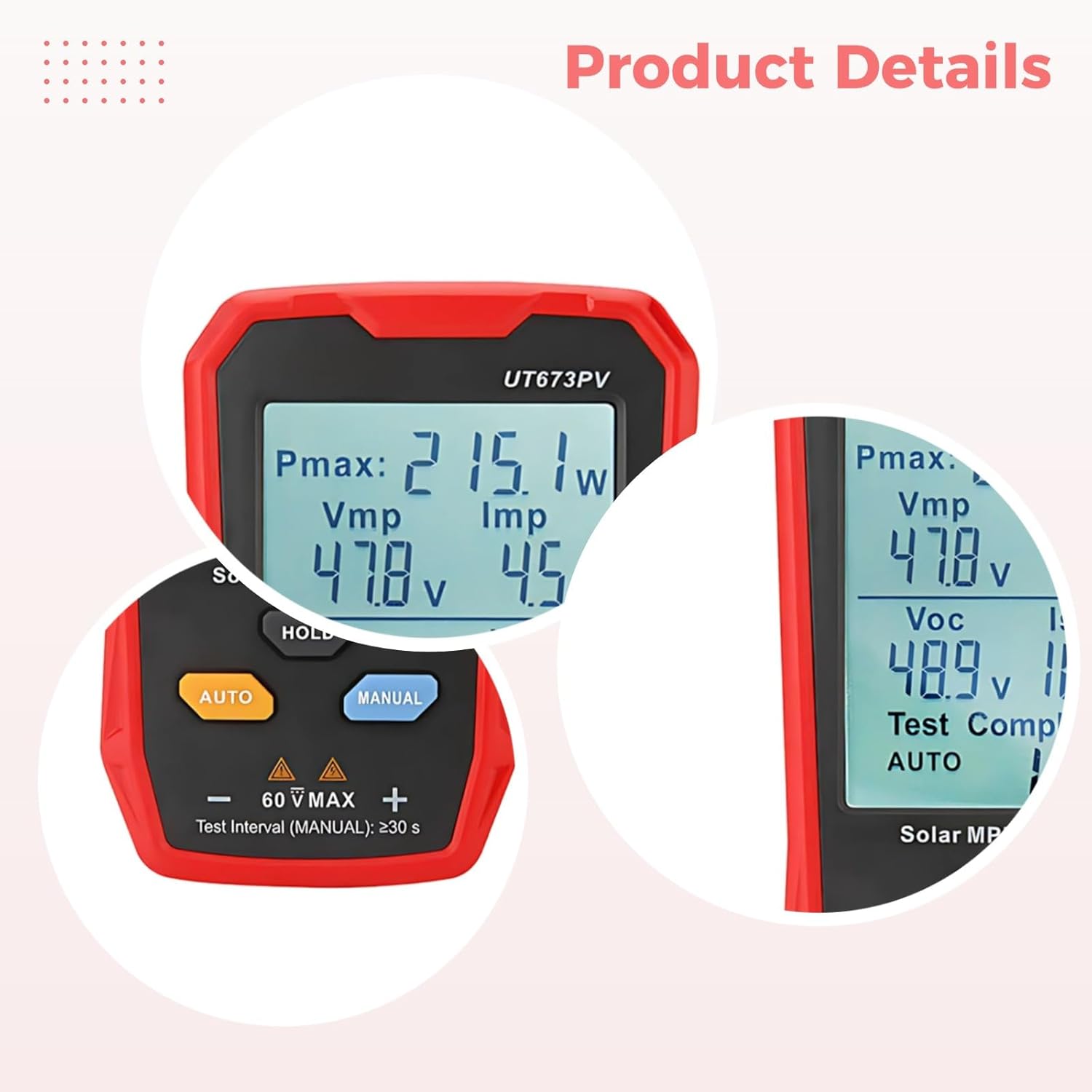Color:red Material:plastic Product Size: 5.59 in x 2.99 in x 0.86 in / 14.2 cm x 7.6 cm x 2.2 cm Package Includes:Photovoltaic Module Maximum Power Tester*1 Note: - Please refer to the measurement. Tiny measuring error is allowable in normal range. - There might be a little color difference due to the monitor, camera or other factors, please refer to the physical item.