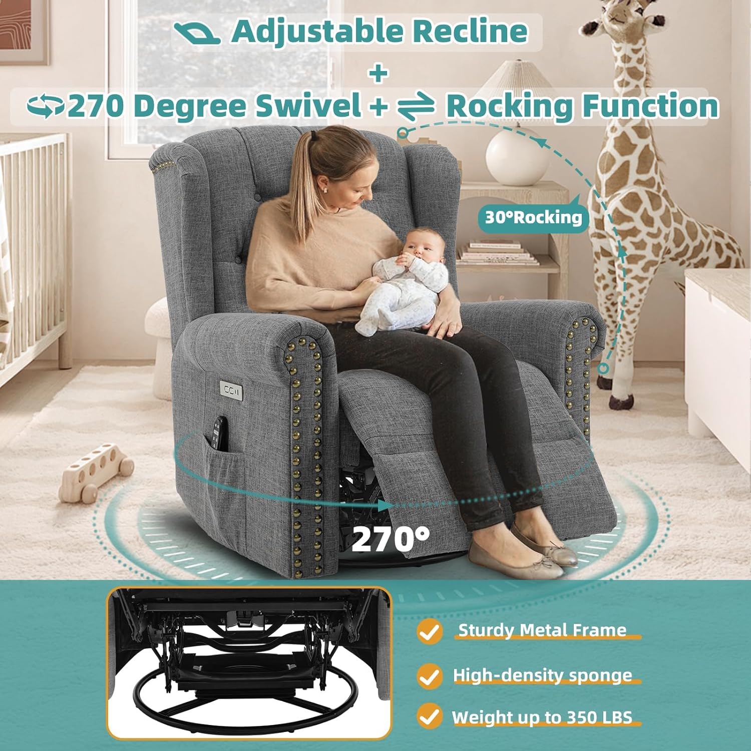 | Additional Features | Swivel & Rocking Reclining, Heated & Vibration Massage, Type-C & USB Ports, Electric Adjustable Backrest & Footrest by Switch, Nailhead Trim, Tufted Upholstered |