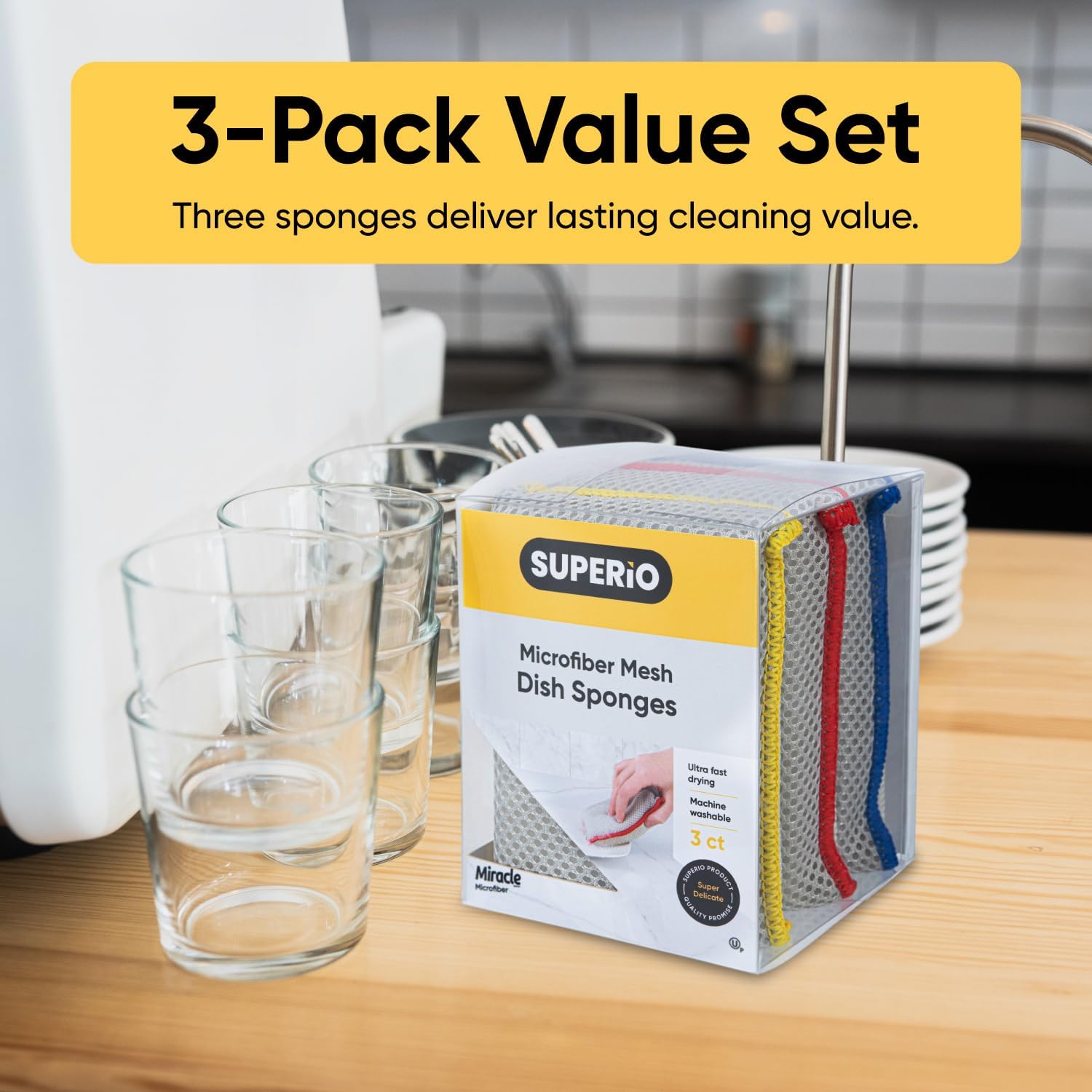 Is the sink filled with dirty stuff? The car windshield is not even transparent? The bathroom needs a clean? Are furniture/appliances dusty with fingerprints? To all these millions of questions, Superio has the only answer: microfiber sponge! The microfiber fabric cleans everything at any time. Get to know what microfiber can do. Clean everything in your home, from the kitchen and living room to your bathroom and outdoors. After cleaning, pop your all-purpose large sponge into the dishwasher or washing machine and ear dry. Now, you have the time to rest! Save money by using reusable sponges.