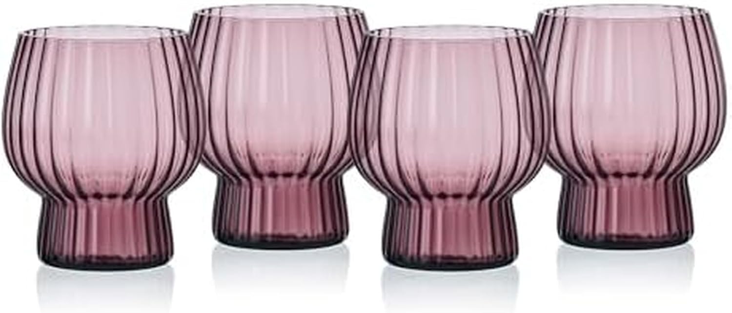 This modern and alluring Phoebe Optic Amber Set of 4 Double Old-Fashioned Glasses by Mikasa adds contemporary style to any gathering with wide bodies, vertical line designs, and an eye-catching color tint. Made of glass with a solid amber tint, these contemporary and stylish glasses can be used to serve beer, a variety of cocktails, or cold beverages, have open stem bases for added capacity, and stack for compact storage in your cabinet when not in use. Set of 4, each measuring 4-1/8 inches high with a 3-1/2 inch diameter and 14-fluid ounce capacity. Dishwasher safe.