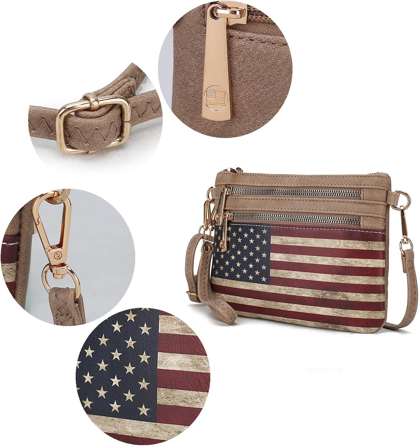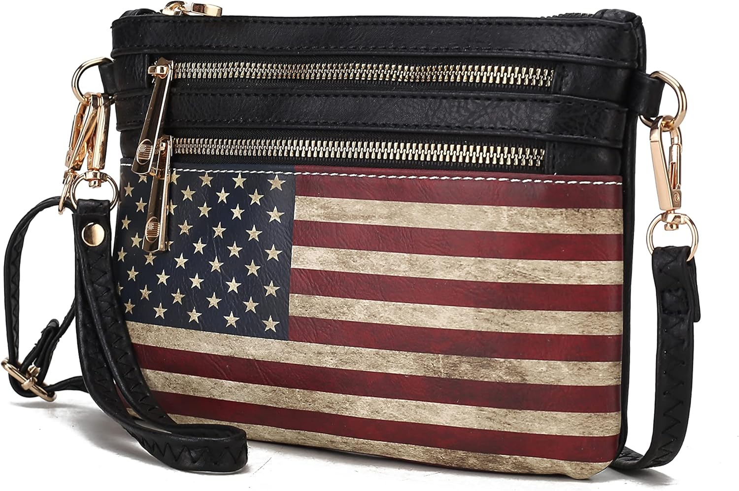 This elegant crossbody bag, crafted from premium faux leather, exudes luxury. It boasts a fabric lining and is adorned with lavish gold-tone accents and rhinestones. The bag showcases a tab-front design with a studded Milan logo, a zip-top closure, and a roomy interior with one compartment and two slip pockets. The exterior features a back zippered pocket and two front zippered pockets. It comes with a detachable/adjustable shoulder strap that extends up to 48 inches and a removable wristlet strap, measuring 7 inches.
