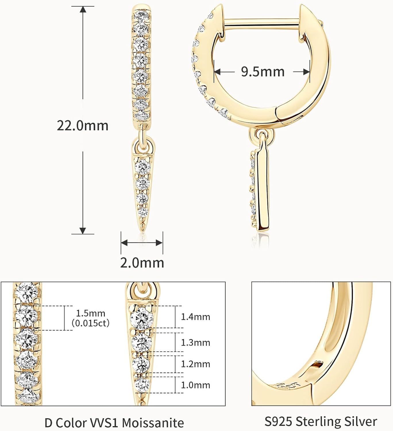 ABOUT EONFUN JEWELRY EONFUN is a brand company specializing in the production of Moissanite Jewelry, with professional technical personnel with more than 10 years of experience and design teams. We are committed to creating a warm and lively fashion jewelry brand that helps customers retain great memories. ✅SPECIFICATION: Height: 22mm Inner diameter: 9.5mm Material: 925 sterling silver Gemstone: 24pcs, 0.26cttw Moissanite/Pair Occasions: Wedding, gifts, appointment, work, anniversary, travel and any other occasion. Suitable Group: Women, Mom, Mother in Law, Wife, Aunt, Best Friend, ect. ✅PACKAGE INCLUDE: 2 x Moissanite Dangle Huggie Earrings 1 x Jewelry Box 1 x Certificate