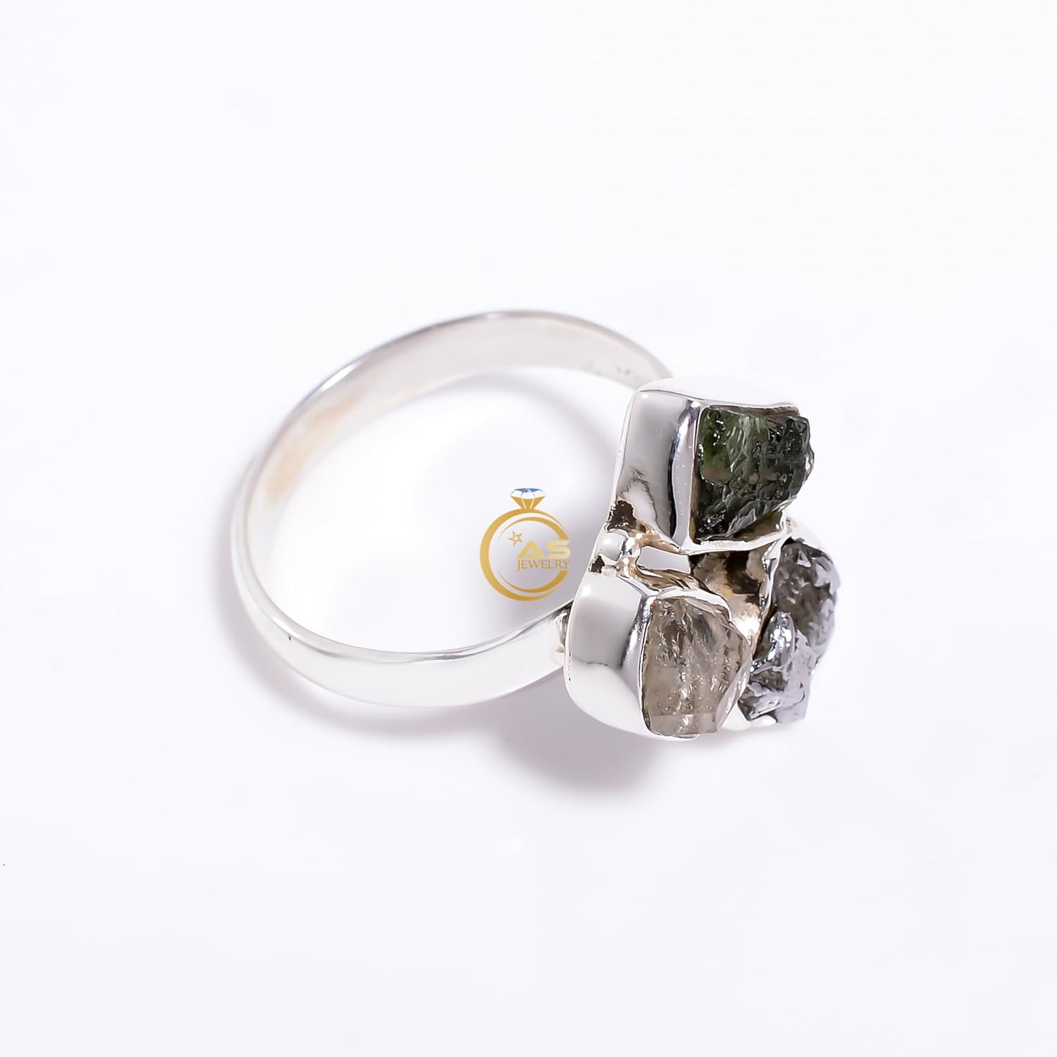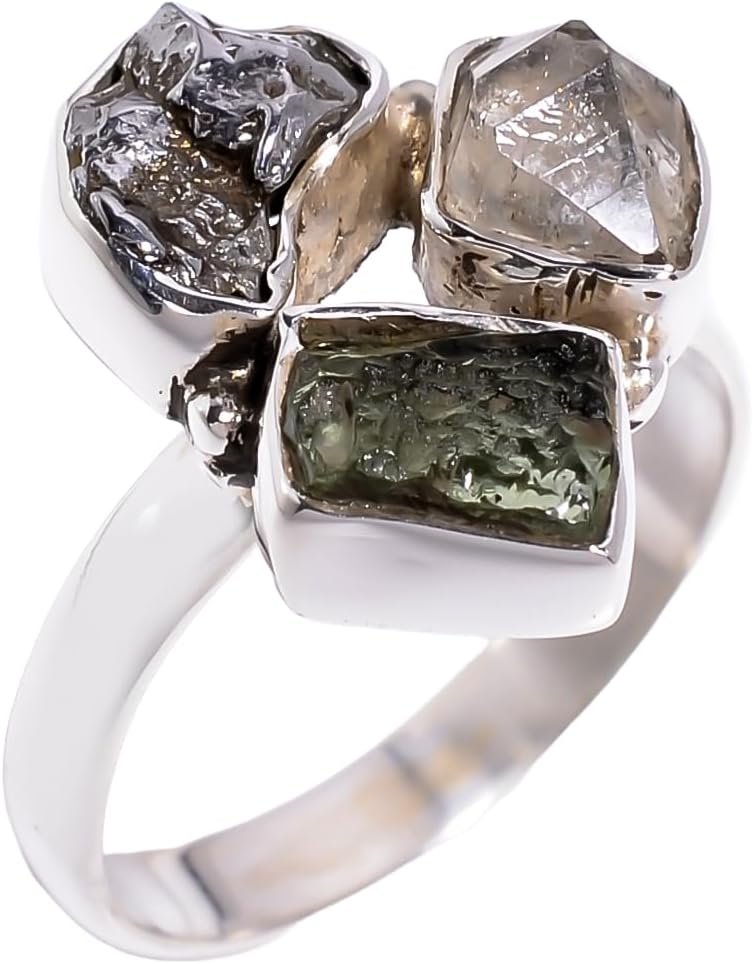 The handmade 925 sterling silver ring you're describing is truly extraordinary! It features the rare and mystical Moldavite, a gemstone born from meteorite impact, alongside the cosmic essence of Meteorite and the sparkling clarity of Herkimer Diamond. This unique combination not only radiates beauty but also embodies spiritual transformation, cosmic energy, and clarity of mind. The ring is a captivating fusion of earthly and celestial elements, making it a powerful and enchanting piece of jewelry that is sure to mesmerize and inspire those who wear it. 》Product Details:- Product - Ring Metal - Pure 925 Sterling Silver Stamp - 925 Gemstone - Moldavite, Meteorite and Herkimer Diamond Gemstone Color - Green, Black and Clear Gemstone Treatment- No Treatment (Natural) Product Weight – 5.00gm Approximate 》About Quality:- Our products are completely handmade and made of pure 925 sterling silver and natural gemstones, so don't worry about the quality, 100% customer satisfaction guaranteed. 》Please Note:- Because it is a natural gemstone, some slight variations in color and pattern are expected. 》Thank you for visiting my shop!