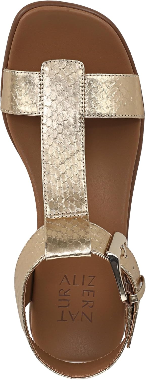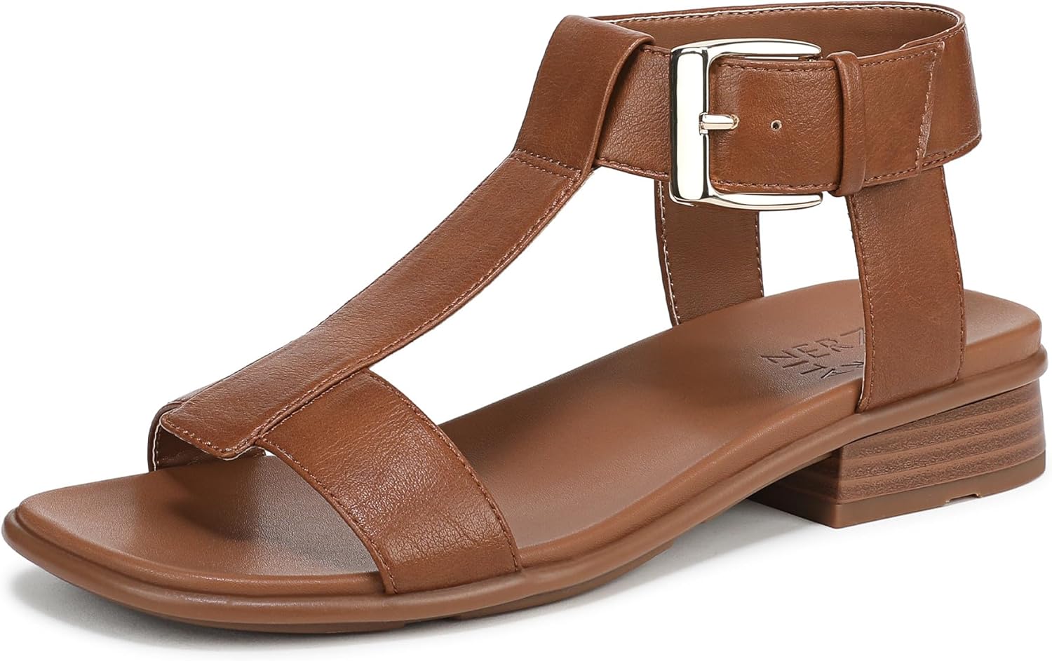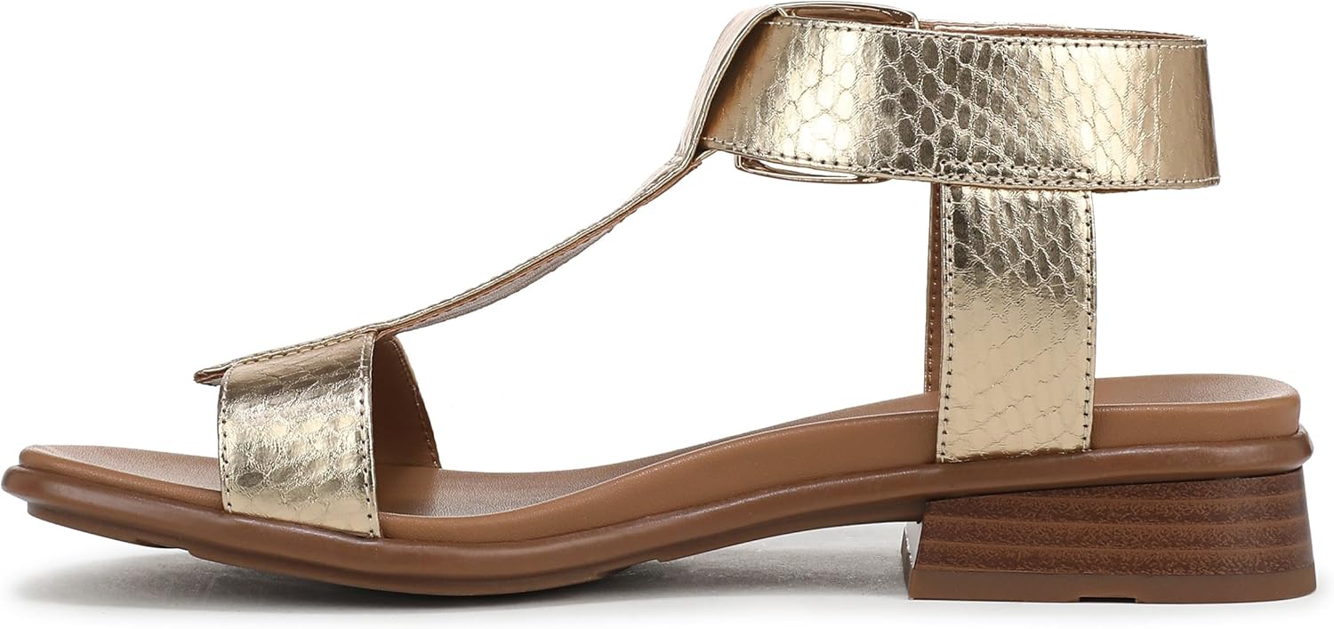 A bold buckle, N Flex outsole, and trending T-strap create our latest sandal sensation. Strappy sandal with thick T-bar. Faux leather or fabric upper and open toe. Contour+ Comfort technology for a premium fit and all-day comfort experience. N Flex outsole: Next-level flexibility, cushioning, longevity, and shock absorption to energize your every move. 1 1/8 inch block heel. Consciously packaged: 100% of our shoe boxes are made of 80% recycled paper + soy-based ink. Outsole crafted from partially recycled materials. WHY YOU'LL LOVE IT: Forever elegant silhouettes with all day wearability, available in an inclusive range of sizes and widths. Designed to the contours of a woman's foot. The Beautiful Fit. Since 1927.