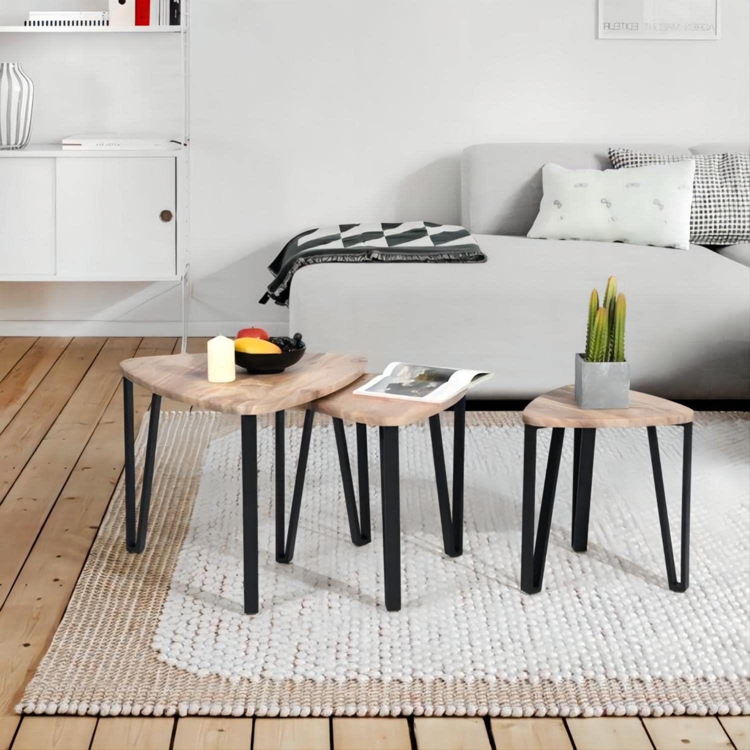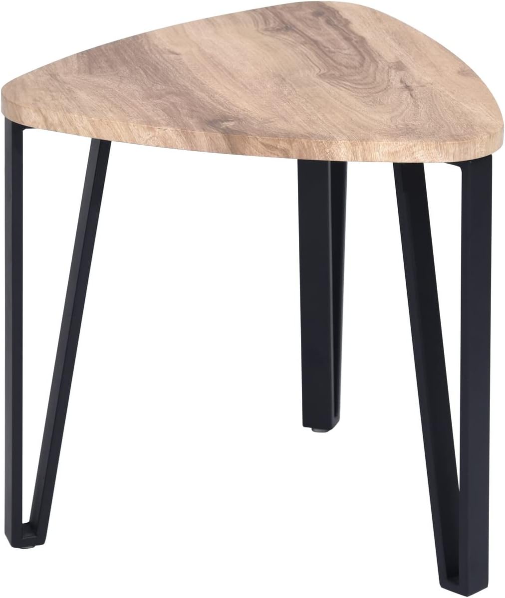 Give your living room plenty of surface area to display plants and framed photos with these three nesting tables. Their bases are made from steel in a black finish and feature three hairpin-style legs for a mid-century-inspired silhouette. Made from engineered wood in a neutral brown finish, the tabletops strike a triangular shape with rounded corners to create a distinctive look. You can tuck them under one another to save on some floor space. Assembly is easy – all you have to do is attach the legs. Specification:Overall Product Dimension:22"L x 22"W x 17.7"H;Overall Product Weight:20.4LB Material:Main Material:Metal & Wood Color:Oak Assembly Required: Yes Country of Origin:china coffee table