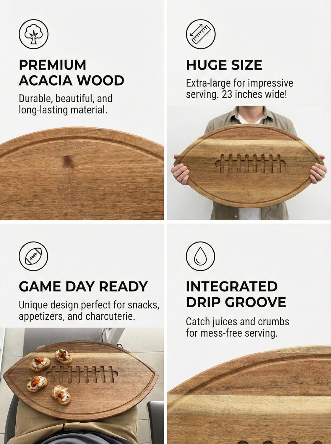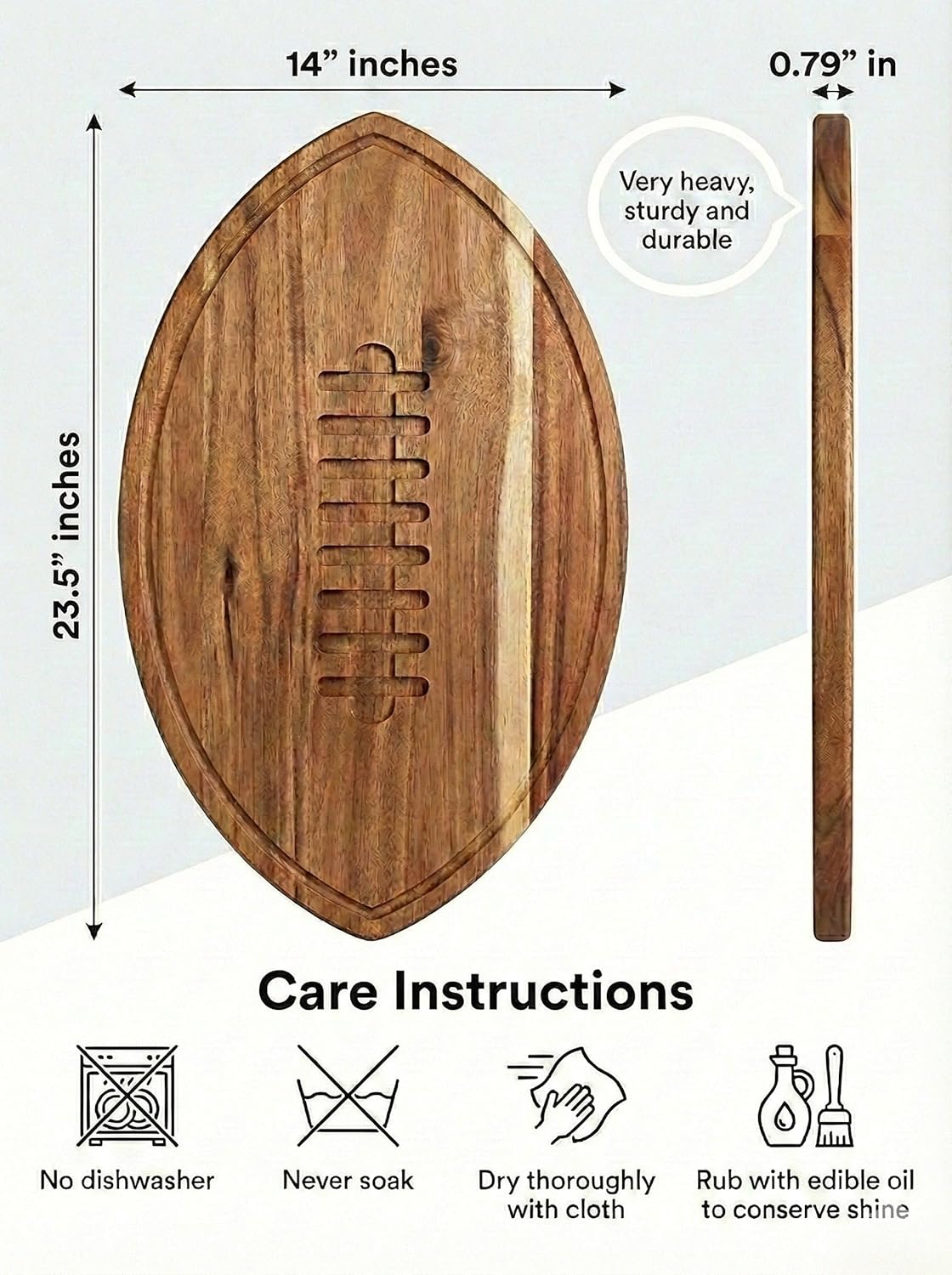 Bring the stadium experience to your home with this Giant football charcuterie board, the ultimate accessory for super bowl hosting, tailgate gifts, and football party serving dishes. Crafted from durable, high-quality acacia wood, this football serving platter is built to last season after season. The Extra Large 23.5x14-inch surface is perfect for displaying cheeses, meats, fruits, or even sweet treats, making it one of the most versatile football serving trays and platters on the market. Whether you're throwing a Sunday night gathering or prepping for the big game, this football party platter serves as the perfect football appetizer tray or football snack tray. It's not just a board—it’s a full-on football charcuterie experience. Great for football themed gifts, fantasy football gifts for men, or even as part of a super bowl gift basket, this tray delivers on functionality and football flair. Ditch the paper plates and level up your presentation with this football wooden tray that doubles as a stunning football serving dish and football cheese board. Your guests will love it, whether you’re serving wings during playoffs or creating a grazing table for the halftime show. This is a thoughtful pick for gifts for football lovers, football coach appreciation gift, or as a centerpiece for superbowl party decorations. Ideal for use as a football field tray, football shaped serving bowl, or even football dip tray for chips and salsa. Don’t miss out on the chance to elevate your game-day hosting game. To care for your board, wash only by hand and dry immediately. Avoid soaking or dishwasher use. For added shine and longevity, rub in a little vegetable or olive oil. Perfect as football fan gifts for men, superbowl accessories, or college football gifts – this football board is your MVP for every game night!