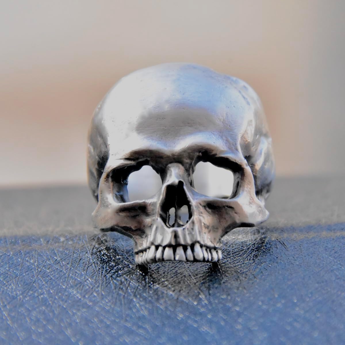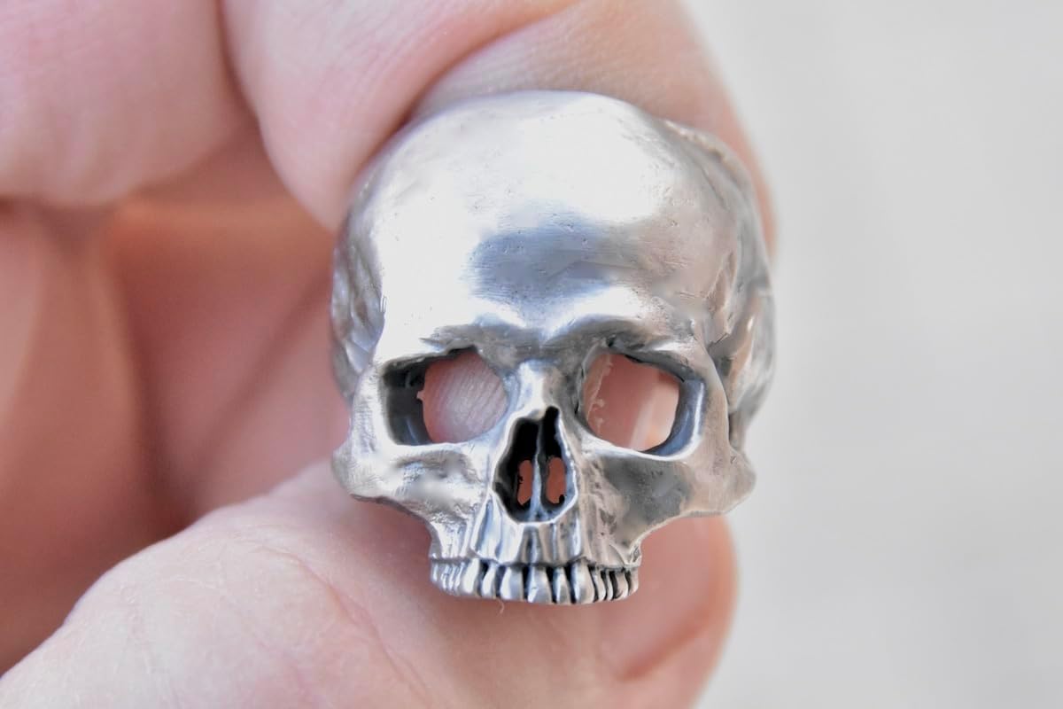 Handmade .925 Solid Sterling Polished Silver Skull Ring.Unique design, made by hand, each of our items are hand crafted.All elements of the jewel are made using the cold carving process.As all this can be seen on the photos. The ring is even more beautiful live than on the images!Every single item is made individually by hand!!!Work only in Sterling Silver 925, not in chrome plated pewter!The ring is stamped, marked .925 !100% guaranteed quality!!!Jewelry design, text/article description and pictures are personal made and copyrighted.Violation of copyright is prohibited.Appropriate action will be taken against anyone who infringed copyrighted policy!!!