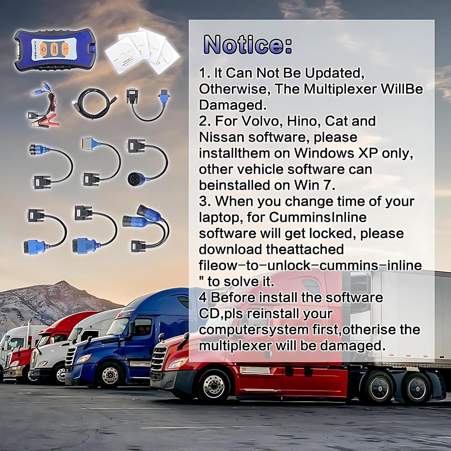 ◆ For NEXIQ 3 detroit diesel diagnostic link scanner tools usb-link 3 adapters universal truck diagnosis tools. support the latest protocols (CAN FD, DoIP), and with the compatibility for a wide range of OEM diagnostics software, the USB-Link 3 is our most advanced VCI to date with the performance and technology you can rely on well into the future◆ Features:1. Support system: XP and windows 7 (ForVolvo Hino Perkins Cat Nissan software must be used on xp system, other software can be used on win 7 32bit) 2. It Works As Great As Nexiq.3. Compatible with applications that diagnose engines, transmissions, ABS, instrument panels and more.4. Reduce reprogramming times with direct USB connection.5. Mixed fleet capabilities with broad protocol support.6. Quick access to vehicle data for maintenance or management reports.7. Quickly attaches to vehicle's diagnostic connector.8. Easy portability increases flexibility, May be used with ta ble or lap top.◆ Package List :NEXIQ-3 usb-link main interfaceOBD II Adapters(441013)J1962 OBD II Adapters(444009)6- and 9-pin Deutsch Adapters(402048 )forVolvo 14-Pin Adapters(442022)forVolvo 8-Pin Adapters(442020)Komatsu 12-pin Adapters(442021)CAT 9-Pin Adapters(448015)3-pin Deutsch Adapters with male and female connector(441033), USB cableCD*4(Special Notice:Not including software.)◆ Service:If you have any questions about the truck scanner diagnostic tool, please contact us and we will provide you with a satisfactory solution.