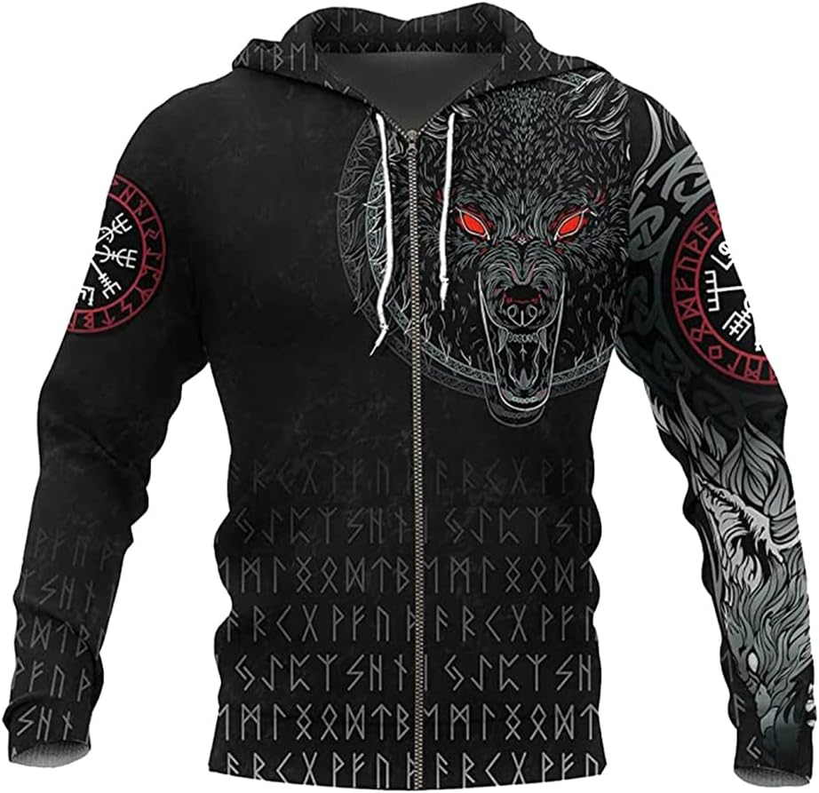 ⭐ As Loki's son, Fenrir is a god wolf destined to devour Odin at the dusk of the gods.This hoodie&Pendant portrays him in an appropriately terrifying and powerful form.His mouth was still open, revealing rows of jagged, sharp teeth, which showed that the gods had good reasons to fear him.●Features:Unisex,Fashion and versatile, easy to create a stylish appearance;360° 3D full printing,Full zip-up hoodies;Large kangaroo pockets on both sides of the front;Adjustable drawstring hood;Healthy fabric 92% polyester fiber & 8% elastane fiber;Double-needle top-stitched neckline;Double-stitched sleeve and waist hems。Season: spring, autumn, winterStyle: novelty, fashion, casual, street, Harajuku8 US Size: S / M / L / XL / XXL / 3XL / 4XL / 5XL (please refer to our US size chart, not the size chart provided by Amazon.)Washing: hand wash/washing machine cold water, low temperature drying, no bleaching, hanging to dry.Packing list: 1x hoodie⭐Tip: If you buy 2 or more you'll save quite a lot on shipping.Because of lighting and display, there will be a little color difference, please understand.Please allow 2-3 cm differs due to manual measurement.
