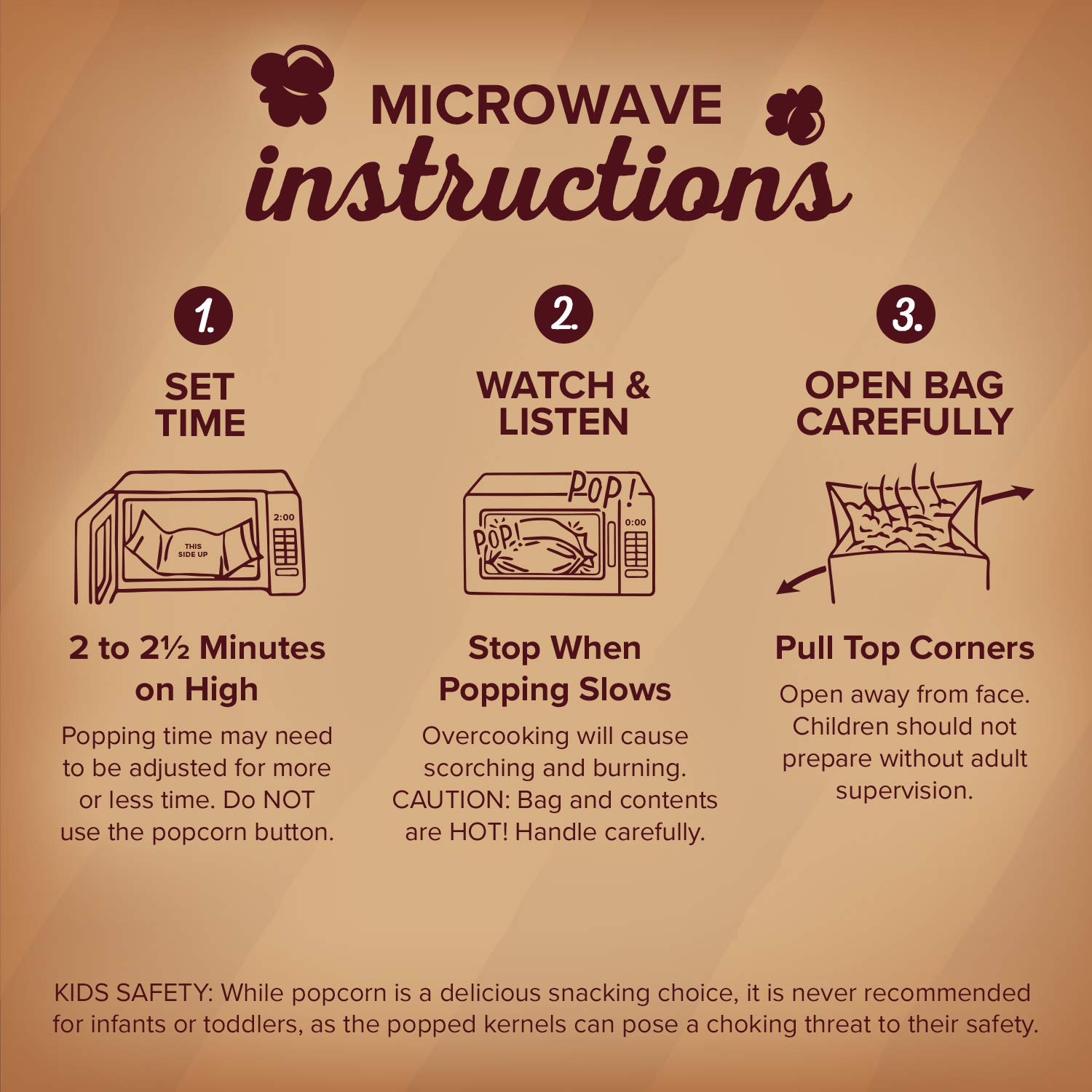 Orville Redenbacher’s Naturals Light Classic Butter & Sea Salt Flavored Popcorn is a natural microwave popcorn that makes a delicious alternative to regular butter-flavored microwave popcorn. This bagged microwave popcorn has 50% less fat and 20% less calories than regular butter-flavored popcorn. It is light and fluffy with a delicious crunch. This box contains six classic sized bags of salted popcorn so that you can share with friends and family during movie nights and game nights. Orville Redenbacher’s Popcorn is a gluten free snack and a 100% whole grain popcorn. It is a light popcorn snack made with only real ingredients with 100% ingredients from natural sources, and made with no artificial preservatives, no flavors and no dyes (colored with annatto, turmeric and paprika). Place the bagged popcorn in a microwave for 2 to 2 ½ minutes on high, do not use the popcorn button. Stop the microwave when you hear the popping slow. Open the bag of popcorn carefully by the top corners.