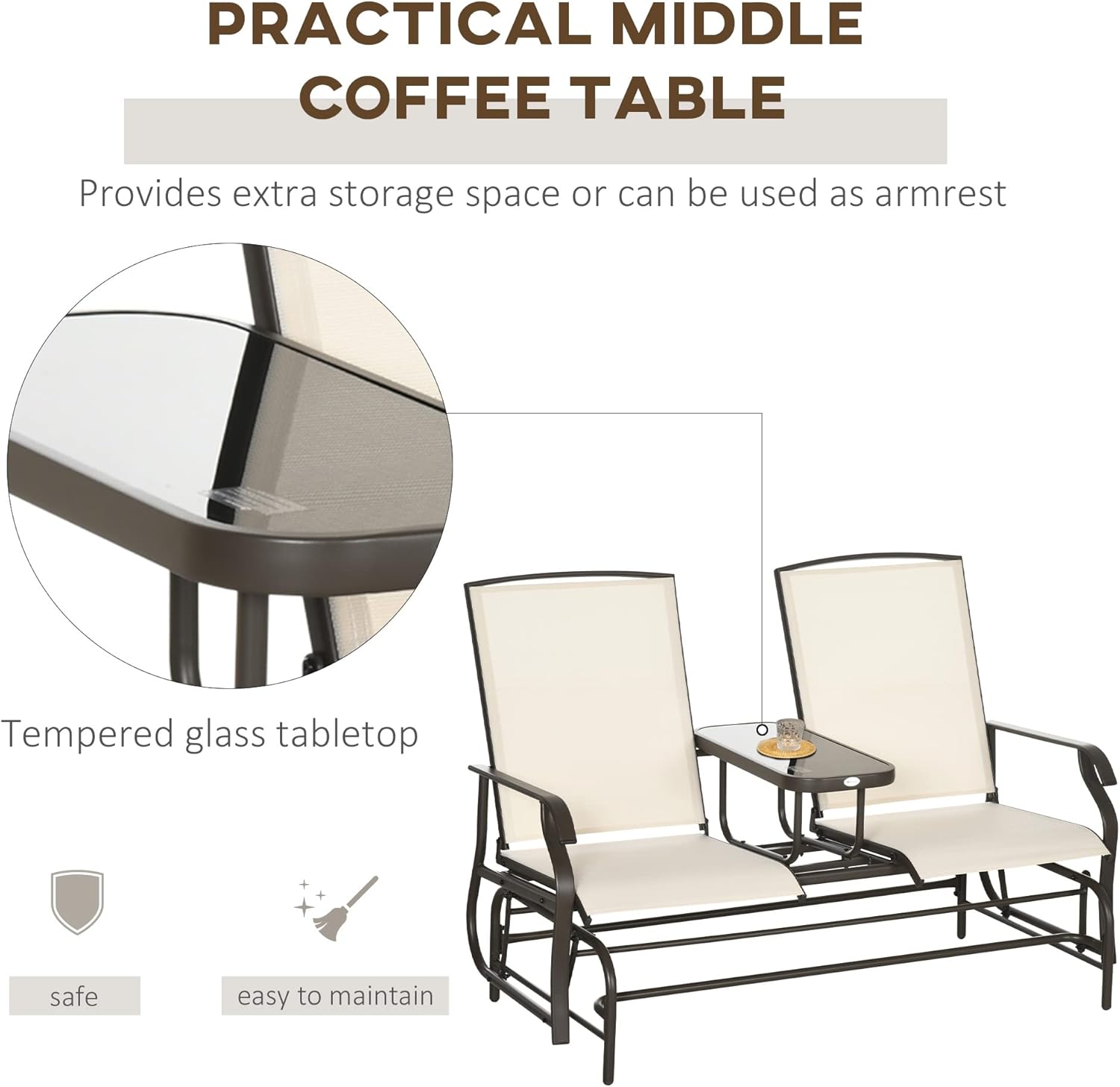 Outdoor Glider Bench with Center Table, Metal e Patio Loveseat with Breathable Mesh Fabric and Armrests for Backyard GPorch, Beige