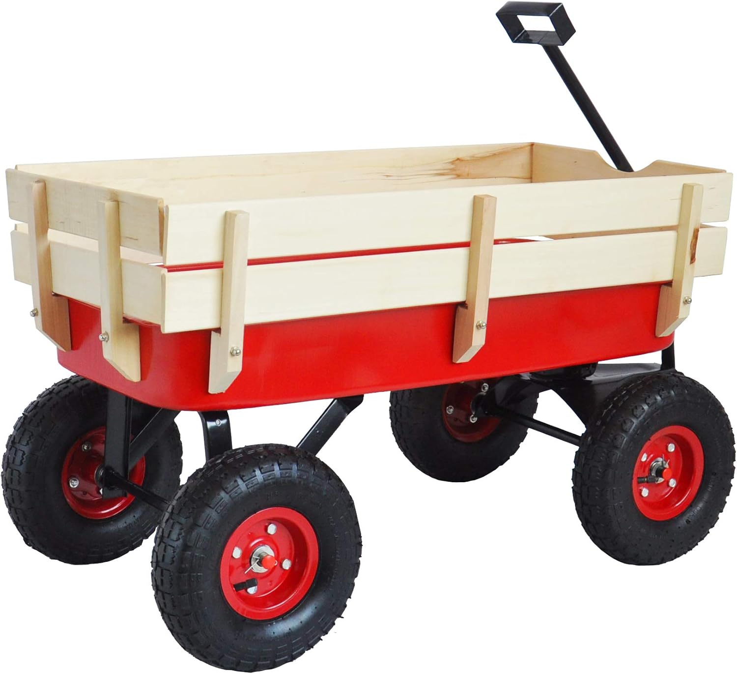 Sturdy Steel FrameAdjustable Ergonomic Handl. The suggested max. loading capacity is 176 lbs.10" Pneumatic TiresSolid Wooden FenceBucket size (including wood fence): 33.86" L x 15.75" W x 9.84" HGarden Wagon Perfect for Kids
