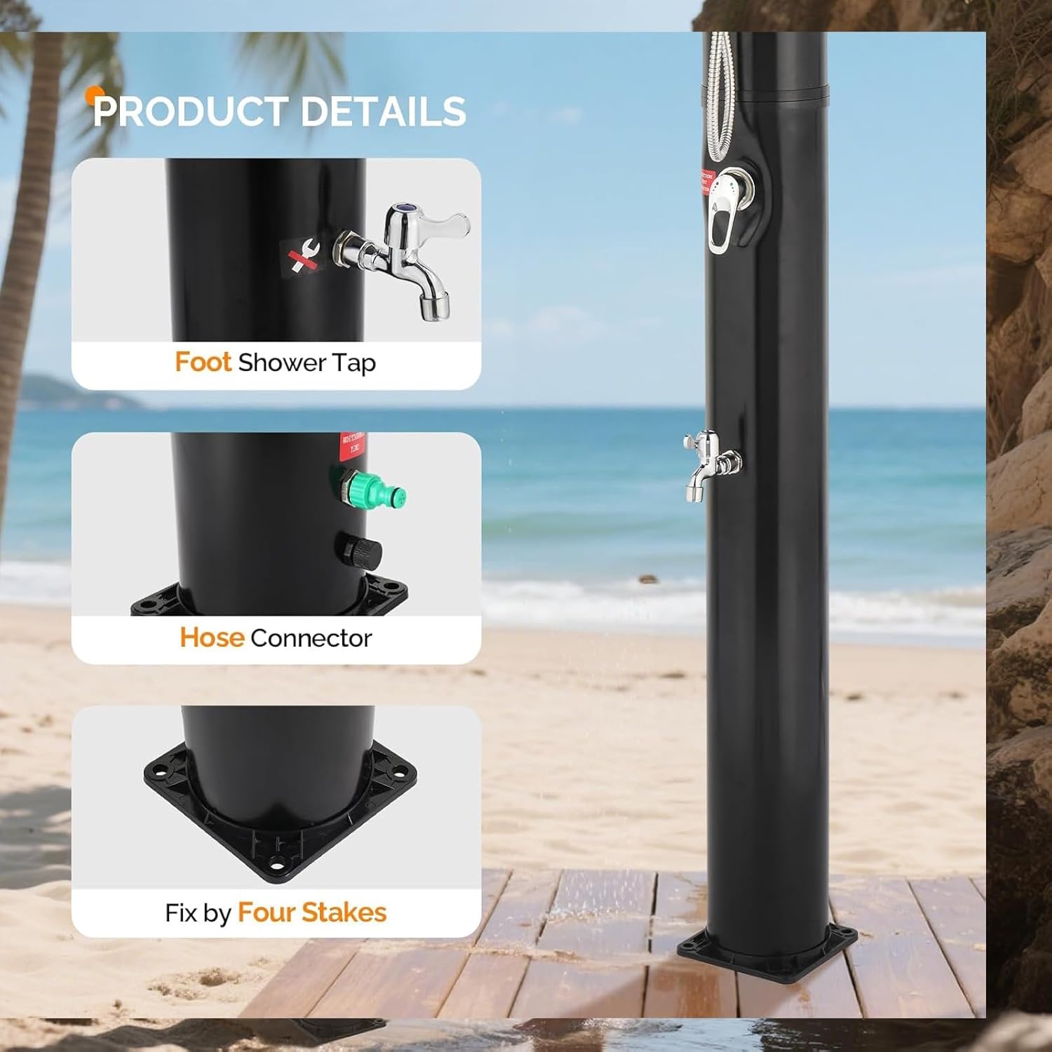 Elevate your outdoor shower experience with the solar-heated shower. This poolside shower can harnesses natural sunlight to warm water up to 60℃ without electricity. The 360° swivel shower head and additional foot shower provide flexibility and easy washing for all users. With two connectors for 1/2" or 3/4" water hoses, this shower seamlessly integrates into your outdoor setup. Constructed from premium PVC and chromed ABS materials, it offers durability that withstand various weather conditions. Specification: Color: Black Material: PVC + Chromed ABS Base Dimension: 14.5 cm x 18 cm Total Height: 217 cm Shower Head Height: 194 cm Foot Shower Height: 41 cm Water Capacity: 35 L Mac Water Pressure: 3.5 Bar Max Water Temperature: 60℃ Net Weight: 12 kg Package includes: 1 x Outdoor Shower, 1 x User Guide