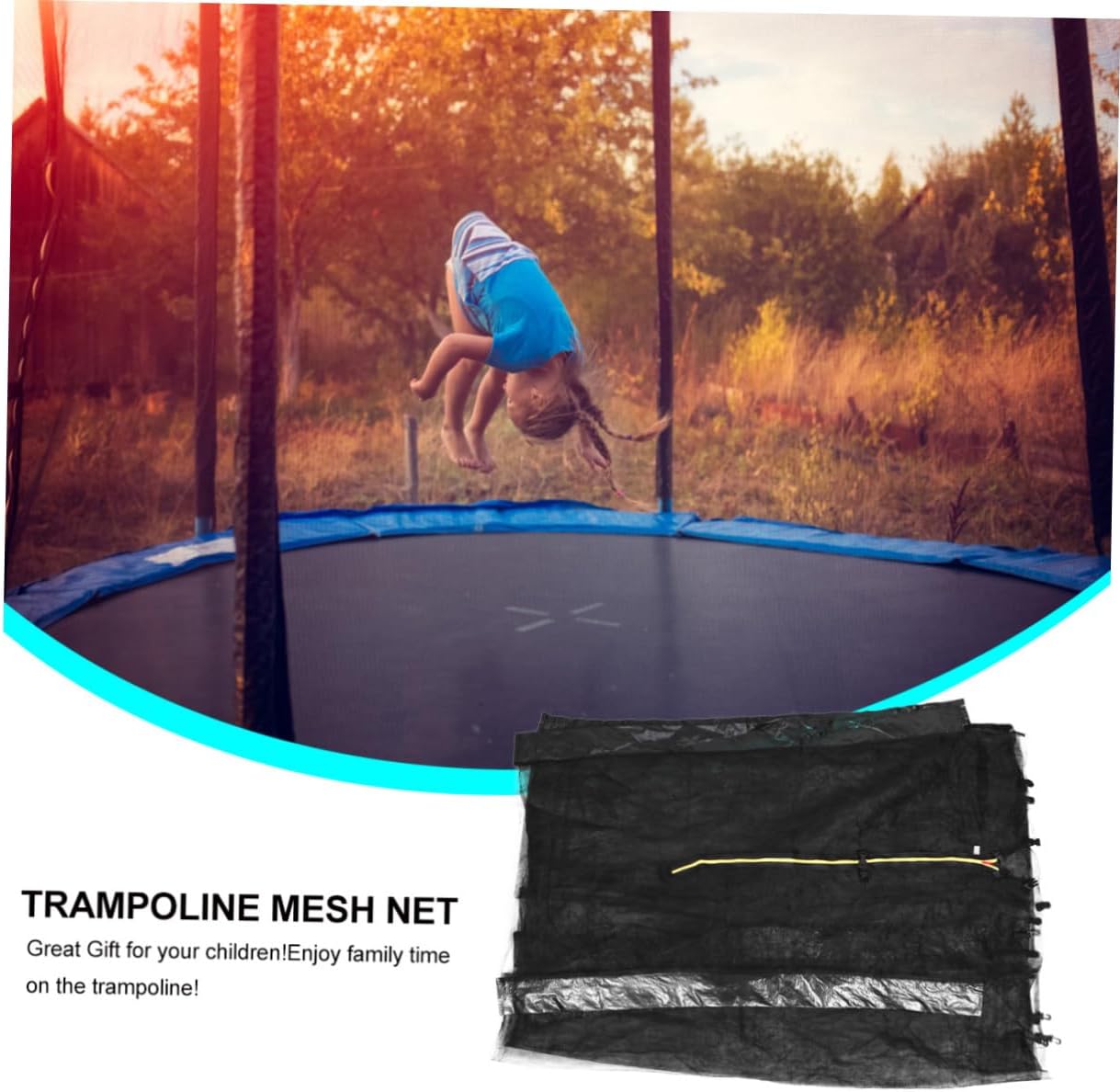 Package Include 1 x Trampoline Protective Net Characteristics - Color: Black Trampoline Mesh Net. - Material: Nylon + PP Trampoline Protective Net. - Size: 240.00 x 160.00 x 0.20 cm/ 94.32 x 62.88 x 0.08 inch. - The 6 ft height net can prevent the jumpping outside of the trampoline Bounce Safety Enclosure Net. - PP material safety net, which is and even though under high temperture. Come with safety zip buckles Bounce Protective Net. - Netting with 6 straight poles, it is easy to fit and install Trampoline Protection. - High density mesh makes it more solid and ,and fine weave to ensure little fingers cannot become trapped. - Great your !Enjoy family time on the trampoline!Goods DescriptionTrampoline Protective Net Trampoline enclosure net is a must to have to ensure your family's safety! Net features a height which gives assurance of keeping a person inside while jumping! Now you can enjoy your jumping experience you are fully protected with this weather-proof enclosure net and protecting you from any accident