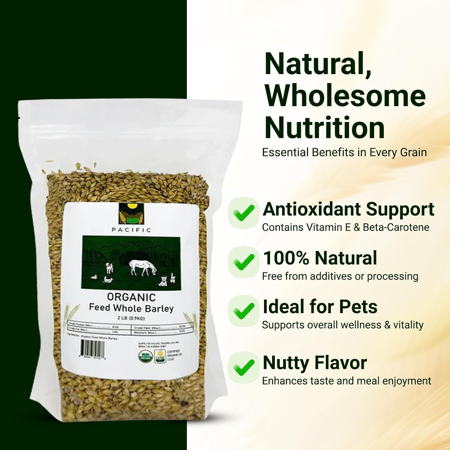 Organic feed barley is a premium, nutrient-dense grain grown sustainably without synthetic pesticides or GMOs. Ideal for organic animal feed, it offers essential nutrients like carbohydrates and proteins. Cultivated with a focus on soil health and biodiversity, it's a wholesome, environmentally friendly choice for conscientious farmers.