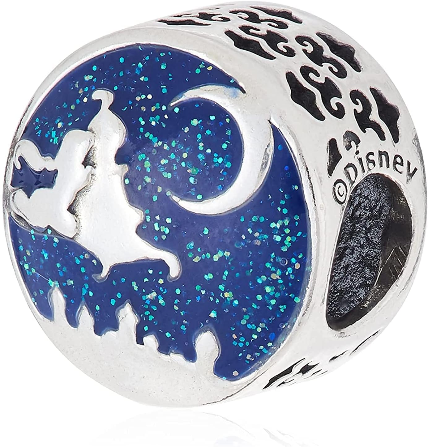 Show your love of Aladdin with this beautifully detailed charm in sterling silver and enamel. Decorated with a nightscape featuring Aladdin and Princess Jasmine flying on a magic carpet and the engraving "You Fill My World With Wonder