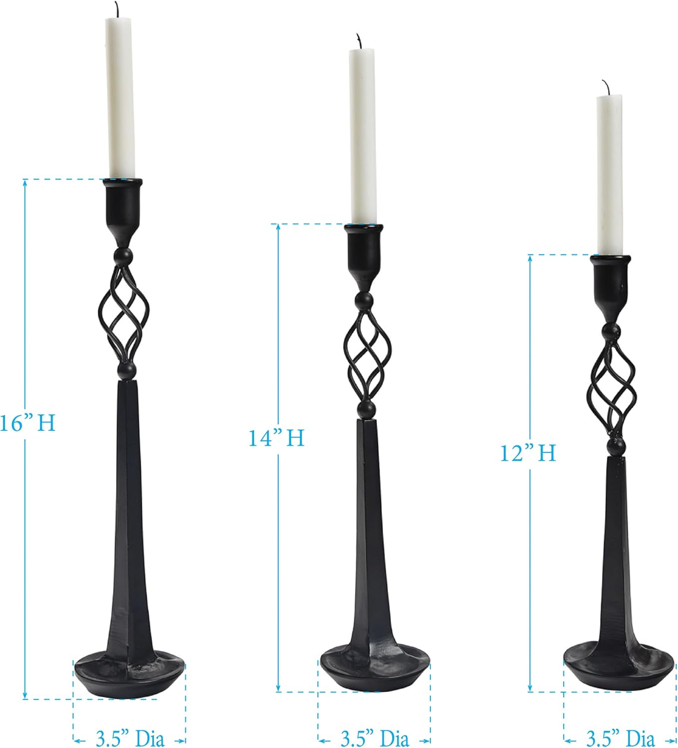 Elegant and simplistic, this candlestick holder trio introduces a vintage statement with timeless beauty in a versatile black finish perfect to utilize in room decor throughout the year. The durable iron structure features a mesmerizing design of twisting open swirl details that brings a charming antique touch to any table centerpiece display or decorative arrangement in any room.