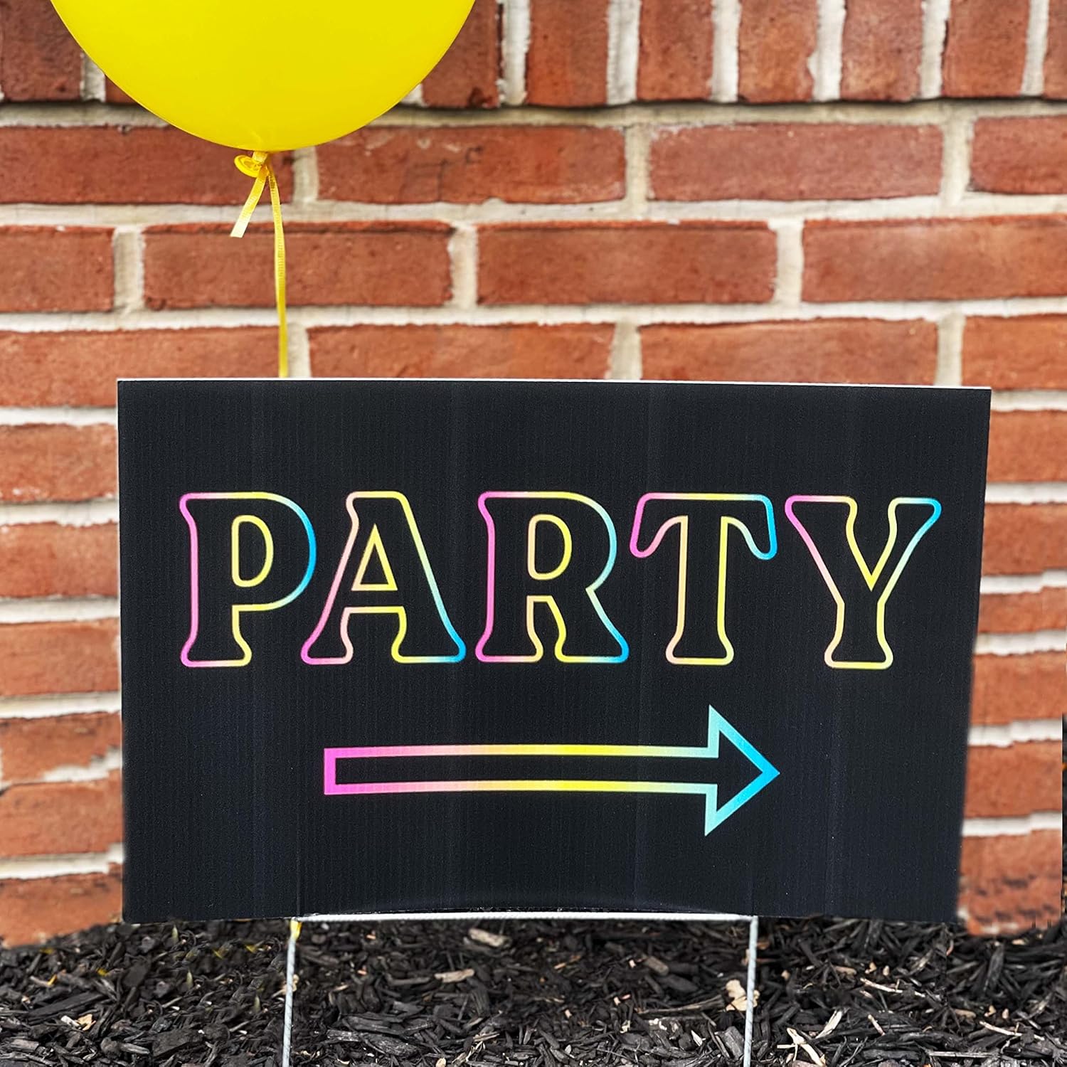 Do the guests in your party need a little help getting to the venue? These directional lawn signs will help the guests of your party find the location with ease. The sign is double sided and the arrows go both right and left directions depending on the side. Help your guests find your event or party in your neighborhood or at venue with this 12” x 18” Weatherproof indoor/ outdoor corrugated plastic sign. The directional signs are easy to see from the street and are even better when you add balloons! Our lawn signs are printed on sturdy corrugated plastic and comes with H stake for displaying outside. Great for along roadsides, in front of stores or in gardens lawns, yards, campgrounds, hiking trails, wedding venues, college campuses, schools, businesses, playgrounds, outdoor dining areas, realtors, parties and more. Great for entrance to party or wedding and for holding balloons.