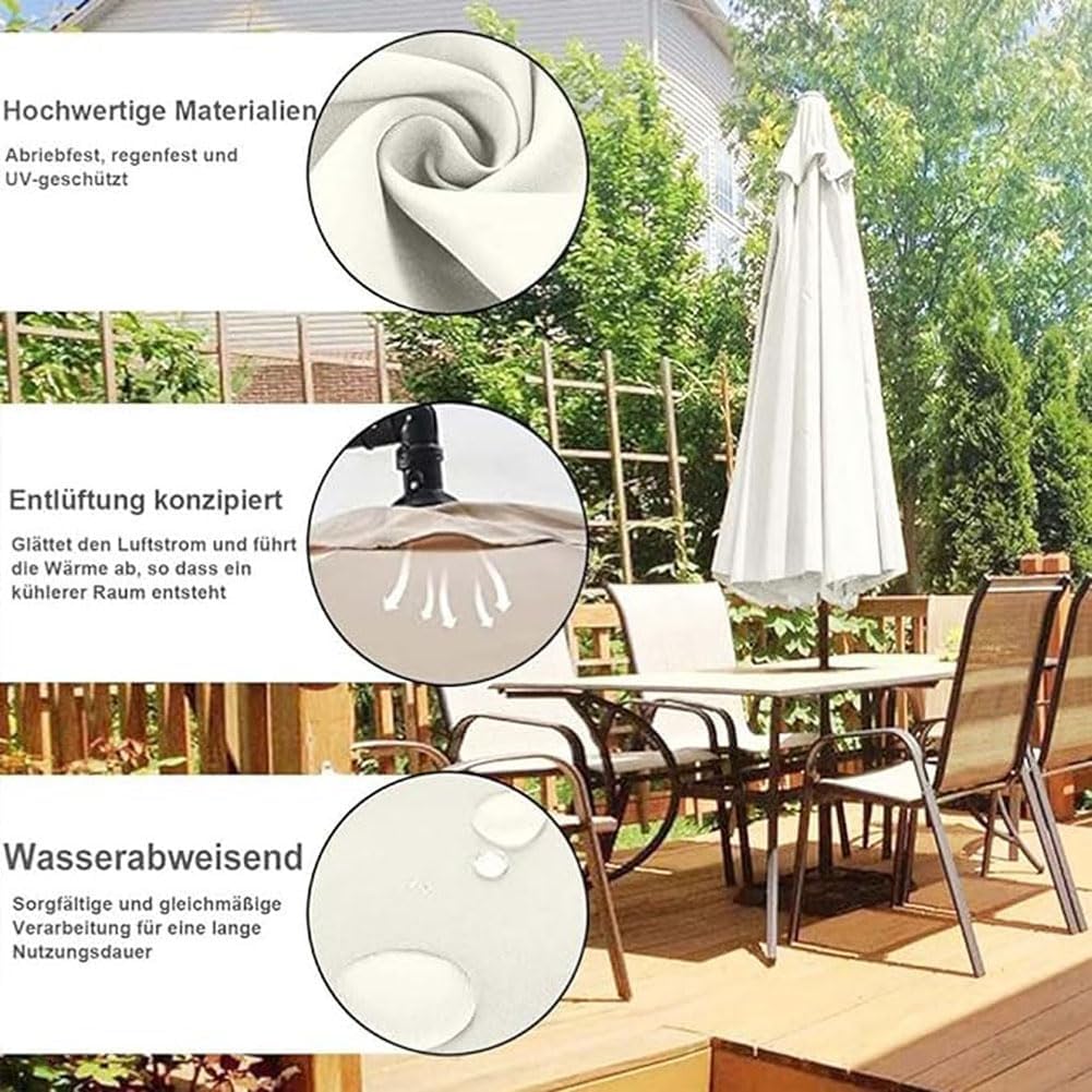 Description:--- Replacement Parasol Canopy made of polyester fabric, 30+ Protection, abrasion resistance, waterproof --- Removable and washable Parasol Replacement Cover, can be easily dried after rain, easy to clean after use, improves service life of the umbrella--- Easy to Install,Once you've unscrewed the top cap on your parasol and removed your existing canopy, gently insert the 6 ribs or 8 ribs of your parasol into the 6 rib or 8rib pockets of the replacement canopy.--- Replacement umbrella canopy for garden, patio, backyard, pool umbrella.Specification:Product Name: Replacement Canopy CoverMaterial: Polyester FabricShape: round (replacement umbrella cloth)Size:200cm/6.6ft, 270cm/8.8ft, 300cm/9.8ftColor: Red, White, Black, Green, Khaki,burgundy,navy blue,lake blueFits: 6 ribs/8 ribs outdoor parasolPackaging: Contains only a umbrella cloth, umbrella stand is not includedUmbrella Replacement Cloth Measurement methods:--Umbrella cloth with a diameter of 200cm is suitable for Arms with a length of 97 ~ 99cm (38 ~ 39inch)--Umbrella cloth with a diameter of 270cm is suitable for Arms with a length of 132 ~ 135cm(52 ~ 53inch)--Umbrella cloth with a diameter of 300cm is suitable for Arms with a length of 145 ~ 147cm(57 ~ 58inch)Please note:1. Due to manual measurement, please allow a 1-2mm error and make sure you don't mind before ordering.2. Due to the different positions of the pictures, there may be color differences, please understand.