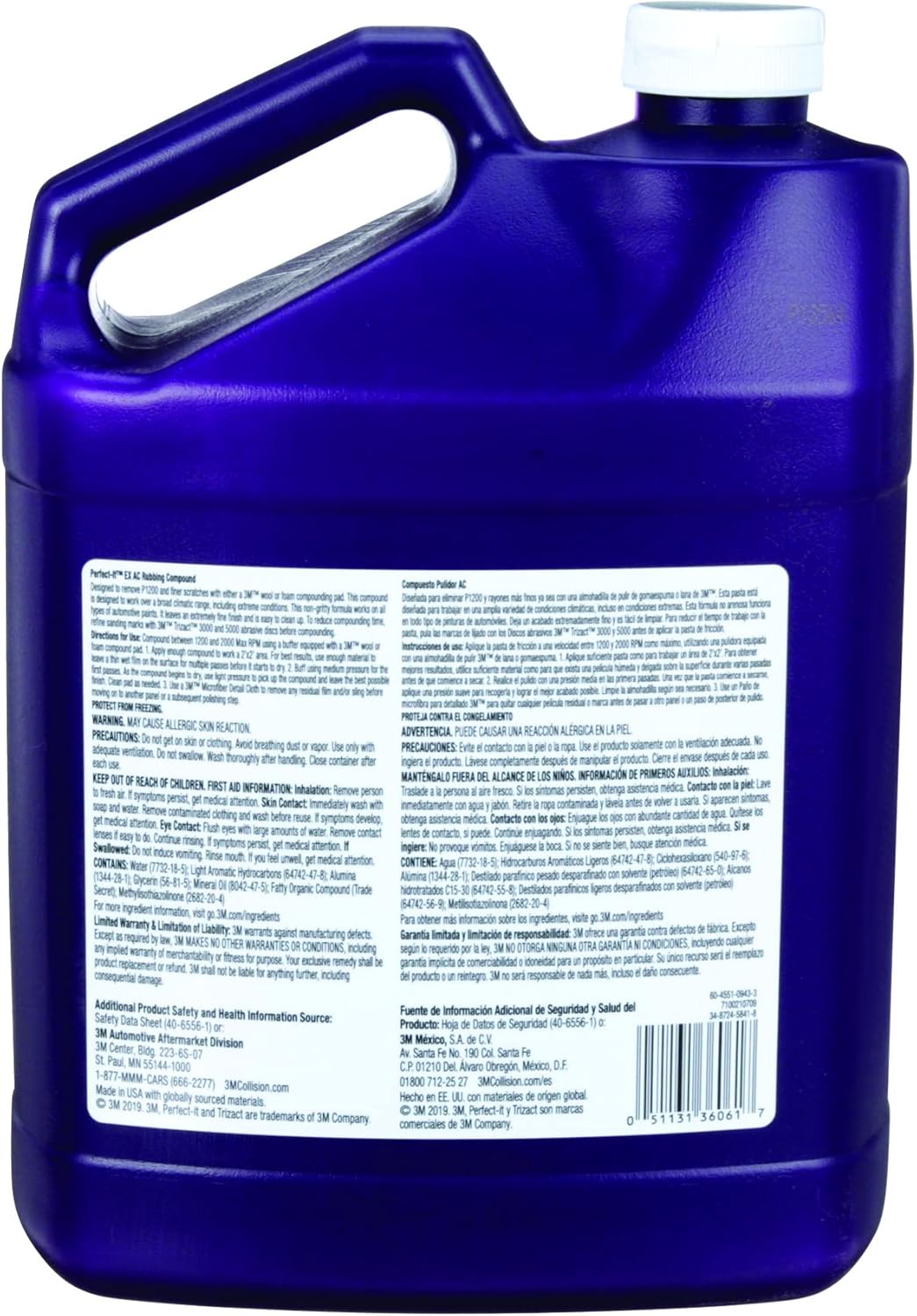 3M Perfect-It EX AC Rubbing Compound 36061 is the highest-performing 3M rubbing compound designed to remove P1200 or finer grade sand scratches and other surface defects. The fast-cutting, aluminum oxide-based liquid abrasive works quickly and uniformly to leave a refined finish even on newer, more challenging paints and clearcoats. The specially-designed formula defies extreme conditions, and is less likely to stick to panels or leave powdery residue regardless of heat and humidity levels. The compound holds well to compounding pads, reducing sling and resulting in less waste and mess, quicker cleanups, and greater efficiency. 3M Perfect-It EX AC Rubbing Compound 36061 is easy to use and produces fine, consistent results during paint and restoration jobs.