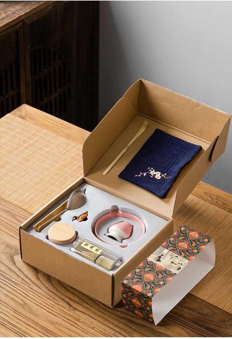 Elevate your tea ceremony with this elegant 9-piece matcha set in soothing pink tones. The comprehensive collection includes a beautifully crafted pink matcha bowl for whisking, a traditional bamboo whisk for achieving the perfect frothy consistency, and a matching whisk stand for proper storage. The set features a fine-mesh sieve for smooth preparation, a storage canister with wooden lid, and a traditional scoop. A decorative navy tea towel with artistic embroidery adds a refined touch. The set comes packaged in a sophisticated kraft box adorned with an ornate decorative band, making it an ideal gift choice. Each piece has been thoughtfully selected to provide everything needed for authentic tea preparation, combining functionality with aesthetic appeal. Perfect for both beginners and experienced tea enthusiasts, this set brings together traditional elements with contemporary design.