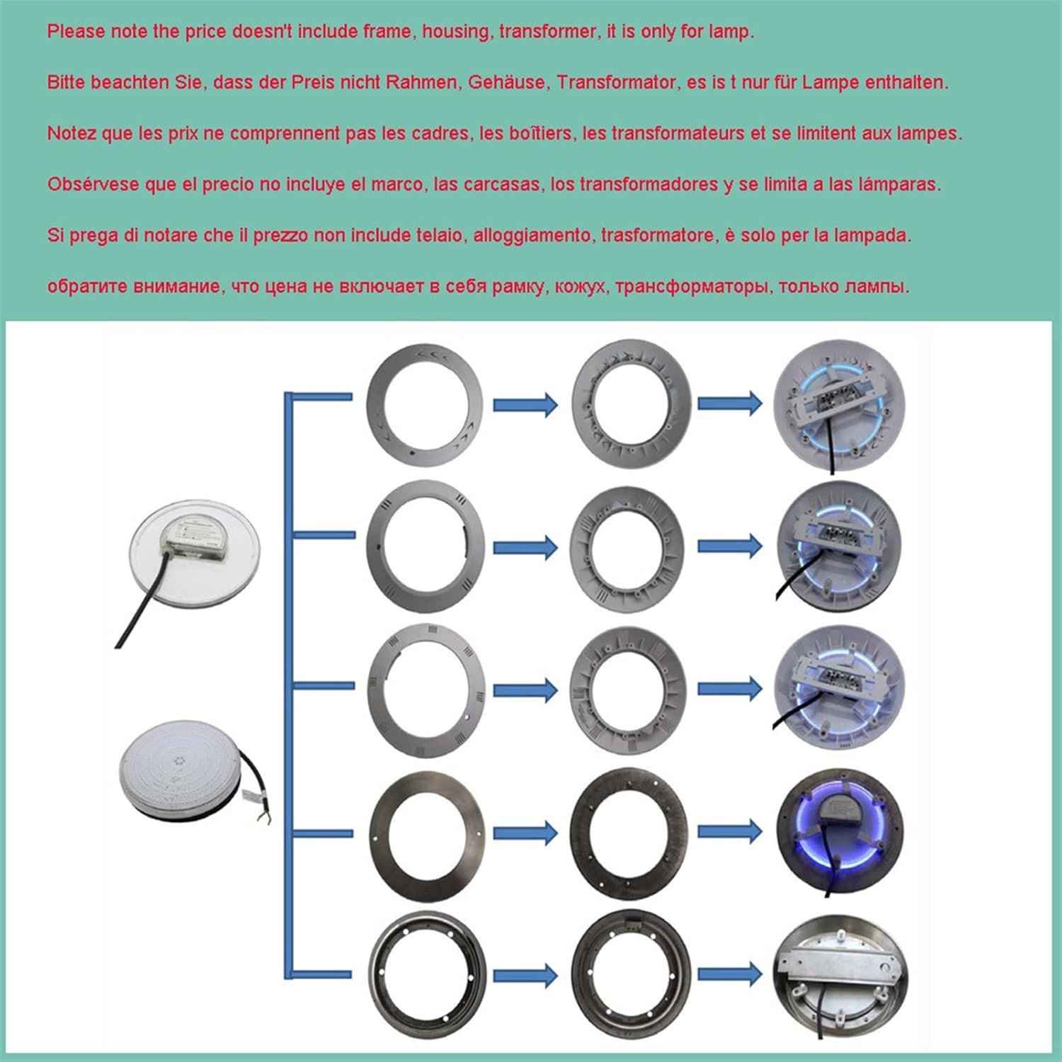 Pond LightsNotes need to be careful.1. Do not connect AC110V, AC230V, or any voltage more than 12V to our lamp, and It only works in AC12V, not DC12V.2. Do not let the lamp on more than 10 minutes WHEN IT IS OUT OF WATER, if not, it will be easier and get burned.3. You don't need to worry when you see the RGB lamps don't show the same color after connecting power, but just switching main power off/on THREE TIMES, they will show the same color.ParametersInput voltage: AC12VLED : SMD 2835 LEDWatt versions: 18W / 42WLamp body material: PlasticLamp dimension: D177xH24mmLamp waterproof grade: IP68 ( can be put into water directly ).Length of power cable: 1.5 meterWarranty: 2 YearsLife Span: 50000 hoursSolid color ( single color ): Warm White ( 2700-3500K ), Pure White ( 5500-6300K ), BlueMultiple color: RGB no remote ( controlled by main power switches on/off )Notes1. The only includes LED Lamp, installation screws, it doesn't includes , frame and housing, BUT you can buy them from us by asking.2. Our lamp needs to be connected a AC12V to convert AC110 or AC230V into AC12V.3. RGB color doesn't have remote, it is controlled by main power switches on/off for ONE TIME to change colors.4. RGB is multiple color, it includes red, green, blue, cyan, yellow, purple, white, and some dynamic modes ( RGB graudal, 7 color gradual, flashing, jumping, ect ).Advantages of our lamps to other suppliers'.1. Our multicolor lamp has switches off/on function.switches off/on means customers can change lamp's color and mode by switching power off and on instead of remote.2. 2 Years warranty and better waterproof grade.3. Much more bright in the same watt.Packing1. If you choose the lamp in single color ( red/ green/ blue/ pure white/ warm white ).*1 piece x LED Pool Lamp*1 bag x Installation aceessories*1 piece x Manual2. If you choose RGB no remote.*1 piece x LED Pool Lamp*1 bag x Installation aceessories*1 piece x ManualLamp's pictureLED Color EffectThe wall switches is not included in , customers can use their own one.