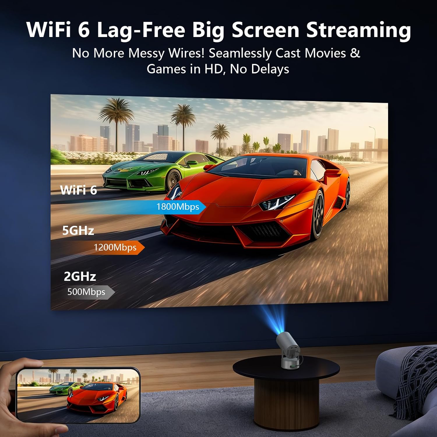 | Additional Features | Built-In Cooling System, Built-In Speaker, Built-In Wi-Fi, Lightweight, ①Built-in Rechargeable Battery ②WiFi 6 +2.4G WiFi Connection ③Bluetooth 5.2 for Immersive Audio④Auto Keystone Correction and 50-100% Zoom ⑤210° Rotating Projection ⑥Native 720P, 1080P Support ⑦Ultra-Portable Design, Supports Table, Tripod, Ceiling Installation. ⑧Compatible with TV Stick, Phone, PS5, Laptop ⑨Movie Outdoor Projector Suitable for Indoor/Outdoor Use |