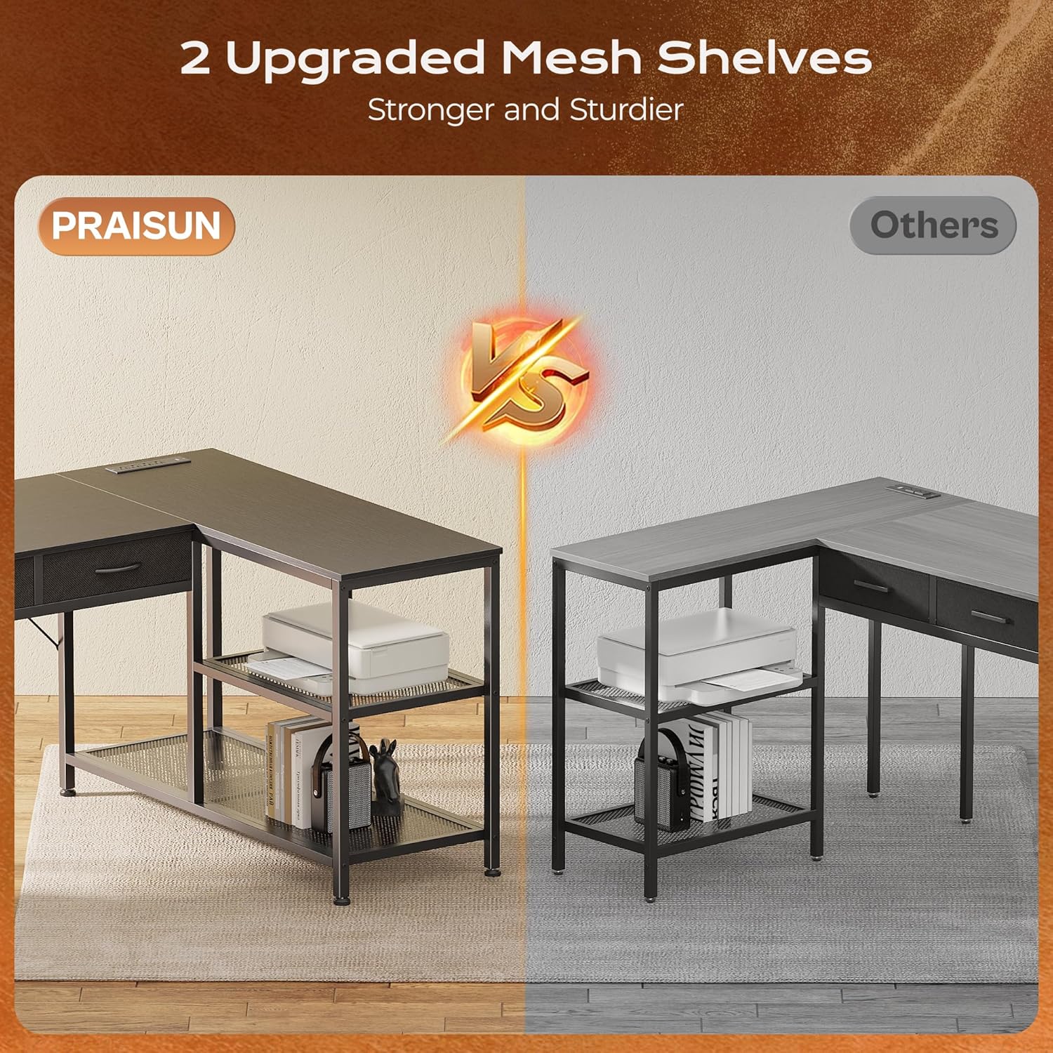 | Storage Options | 3 fabric drawers, 3-tier metal mesh shelf |