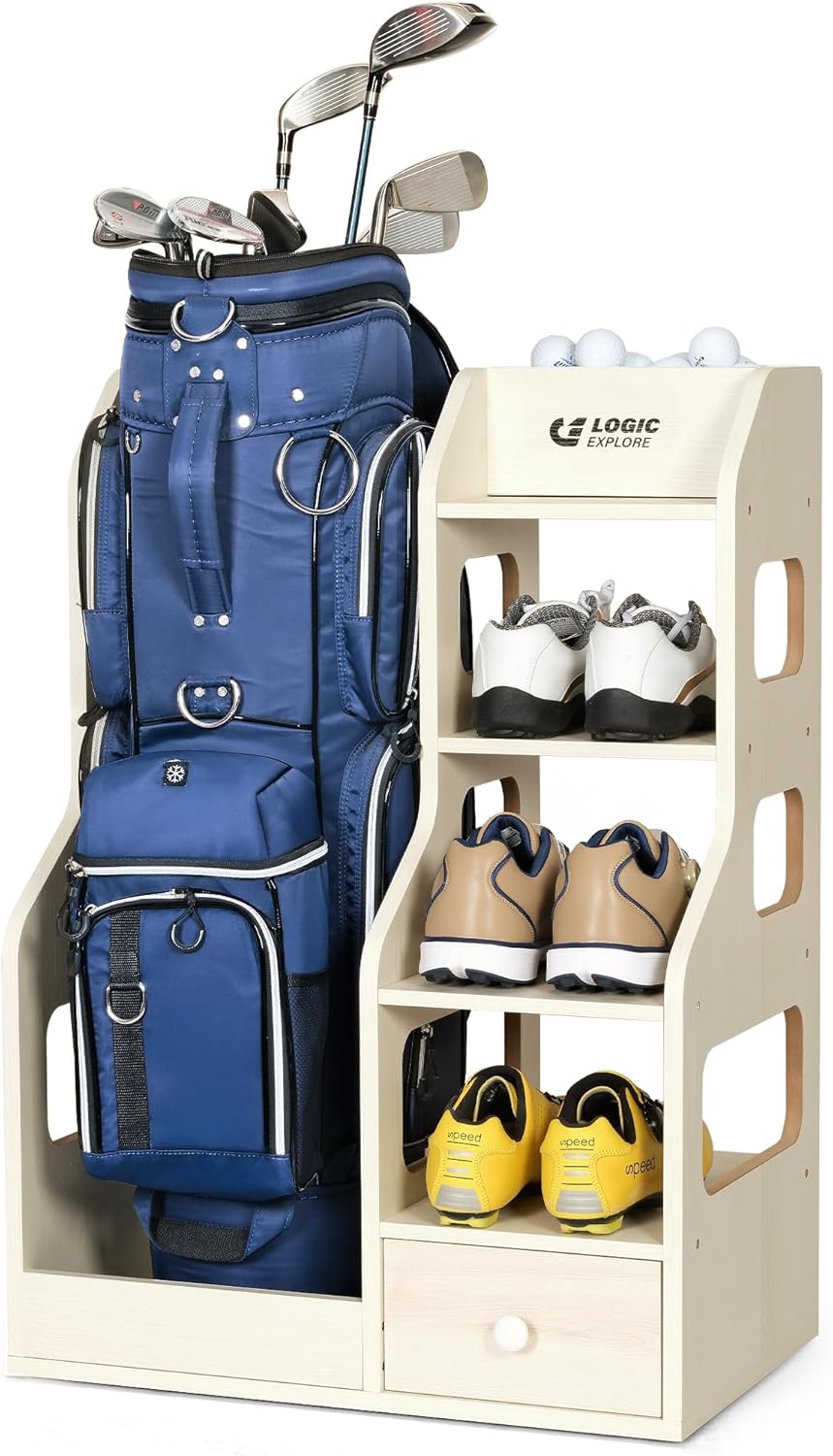 Keep your golf gear organized in style with this Wooden Golf Bag Organizer Rack. Designed to hold golf bags securely, this storage stand features a spacious center compartment and a side multi-layer shelving unit for golf shoes. The top ball holder keeps golf balls within easy reach, while the bottom drawer provides additional storage for small accessories. Crafted from sturdy wood with a modern finish, this golf storage rack is ideal for garages, basements, or indoor spaces. Its multifunctional layout helps reduce clutter and creates a dedicated golf station at home. Perfect for golf enthusiasts looking for an organized and elegant storage solution.