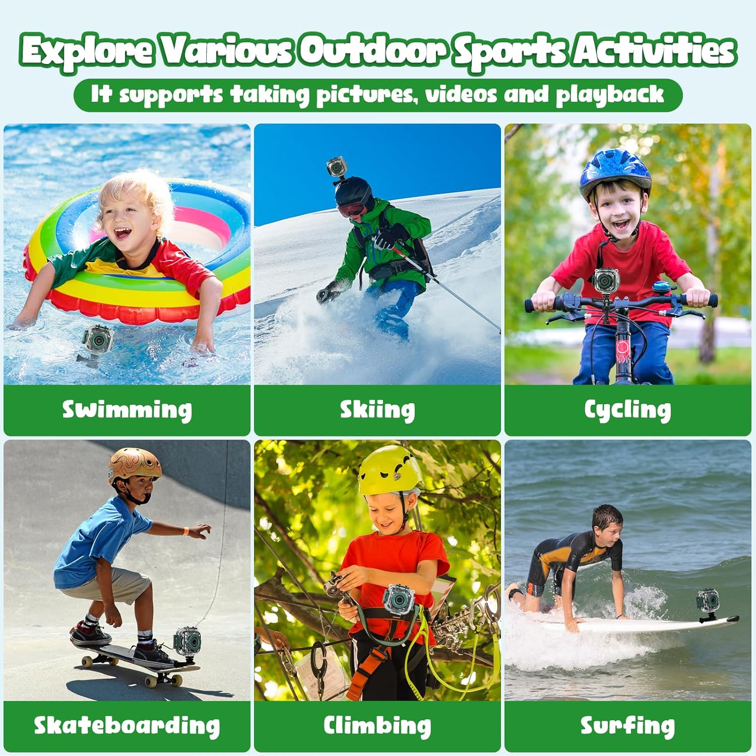 | BuiltIn Media | 1 X Kids Camera, 1 X Waterproof Case, 1 X 32GB Micro SD Card, 1 X Micro USB Cable, 2 X Fastening Straps, 1 X Bicycle Mount, 1 X Helmet mount, 2 X Lanyards, 1X User Manual |