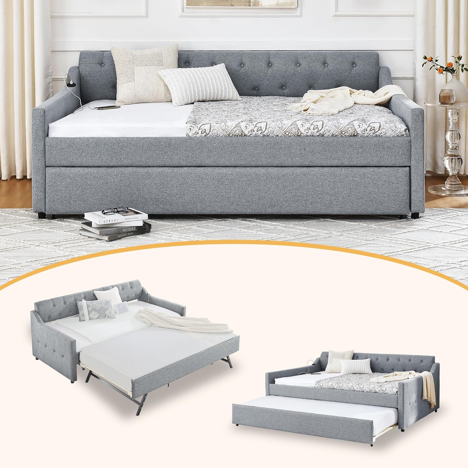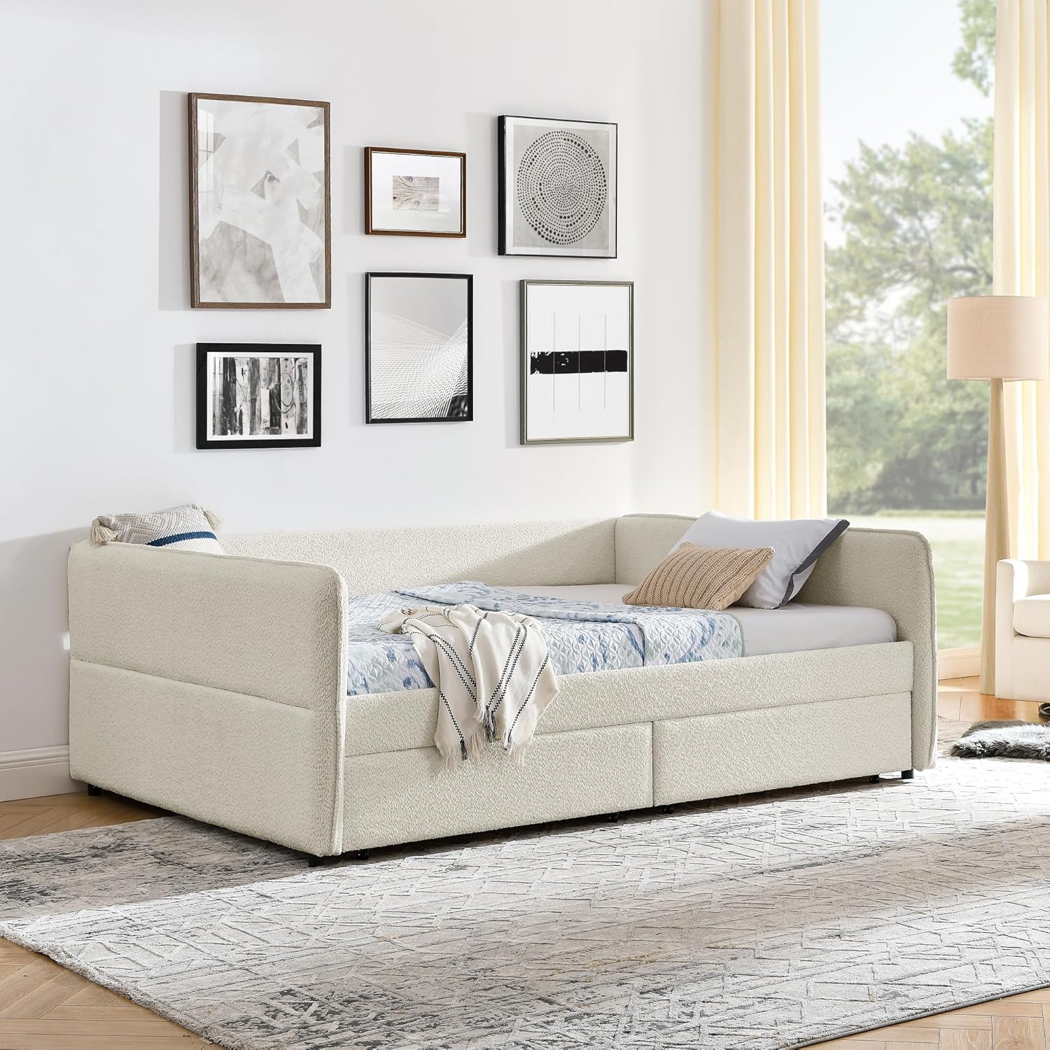 SmartEdge Queen Size Bouclé Daybed with Storage – Modern Style & Smart FunctionUpgrade your space with this queen daybed designed for comfort, storage, and modern style. Upholstered in soft bouclé fabric with thick foam padding, this Boucle Upholstery Daybed features elegant vertical stripes that add designer appeal to bedrooms, living rooms, or offices.Key Features✔ Queen Size Comfort: Spacious queen size daybed measuring 88"L x 65.5"W x 29.5"H—perfect for lounging, reading, or sleeping✔ Built-In Storage: Two large drawers make this a practical Storage Daybed, ideal for bedding, blankets, or accessories✔ b & Supportive: Reinforced eucalyptus wood frame with metal fasteners supports up to 500 lbs✔ No Box Spring Needed: Includes 13 snap-lock slats for a quiet and stable base (fits 5–10" mattresses)✔ Ergonomic Design: Foam-padded arms and backrest provide comfortable support for everyday useMaterials & Setup Materials: Bouclé fabric, foam padding, eucalyptus wood frame Assembly: Easy setup with instructions (ships in 2 packages)This versatile Upholstered Daybed works as a stylish modern queen sofa bed, cozy reading spot, or guest sleeping solution. Its elegant design also complements spaces needing a queen corner bed frame layout.Enjoy the perfect balance of comfort, storage, and modern design with this Boucle daybed built for everyday living.