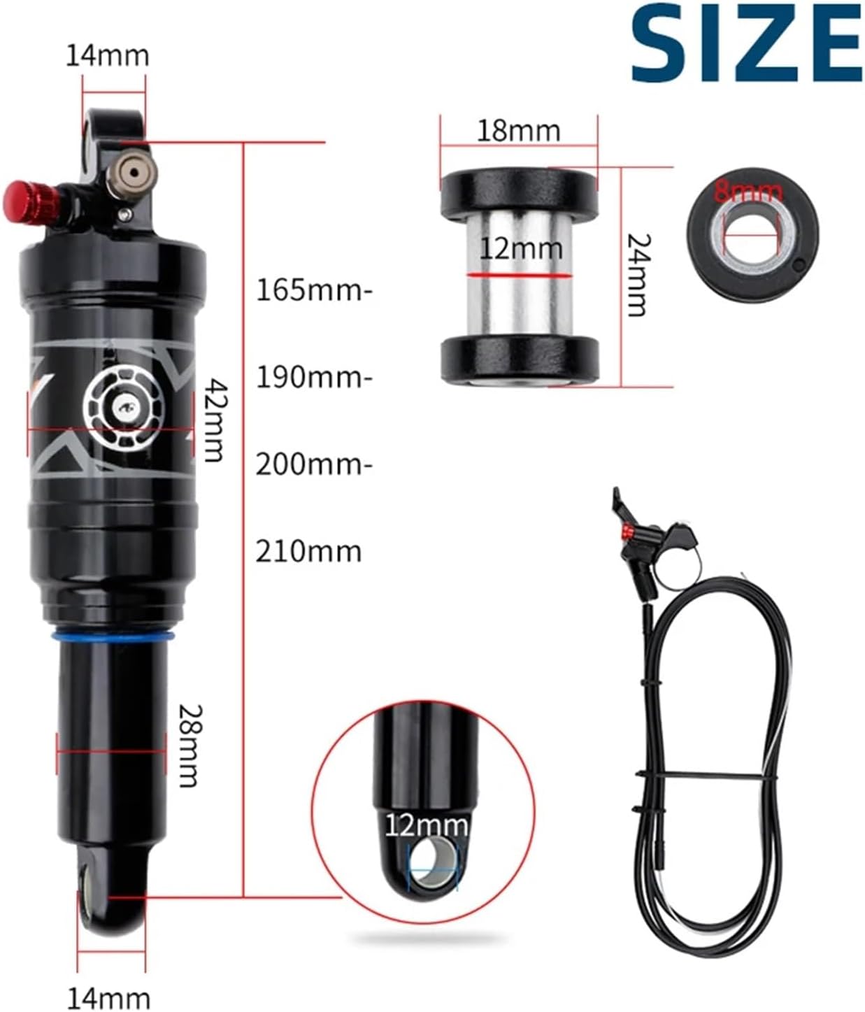 Light Weight Soft Tail Mountain Bike Rear Air Shock Absorber Wire-controlled Lockable Rebound 165 190/200mm Bcycle Shock Absorber Version: wire control / manual controlLength: 165mm, 190mm, 200mm, 210mmStroke: (35,50,53,53) ± 2mmFunctions: adjustable dampingcompression adjustmentair pressure soft and hard adjustment shock absorber lockingFeatures: pneumatic shock absorber, light weight, good mass, superior function, suitable for all kinds of roads, with the air pressure of 270psiShock absorber structureLock switch"+": Locked"-": openMain air pressure adjustmentIt is recommended to use a high-pressure pump with a pressure value for pumpingDamp adjustment buttonAdjust the speed of suspension dampingEach shock absorber is equipped with two 24mm bushings by default.If you need bushings of other lengths, please let us know.There are bushings of the following lengths, thank you.Manual control shock absorber165mm shock absorber190mm shock absorber200mm shock absorber210mm shock absorberWire control shock absorbershock absorber 165mmshock absorber 190mmshock absorber 200mmshock absorber 210mmThe length of the shock absorber is selected.Generally, the frame trader will indicate the installation length and width of the shock absorber of the frame, such as the BXT Carbon fiber pattern frame.Manual control wire control distinctionManual control :The shock absorber needs to be adjusted by hand to lock the switch buttonWire Control:The shock absorber can use the wire controller to remotely control the lock switchWelcome to our store! We offer a wide selection of products and strive to provide you with a comfortable and satisfying shopping experience.